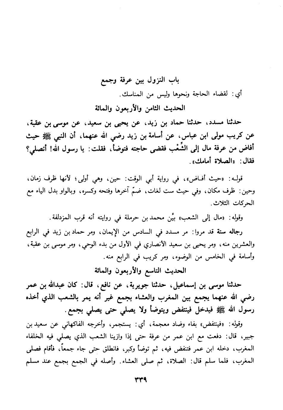 حَدَّثَنَا مُسَدَّدٌ، حَدَّثَنَا حَمَّادُ بْنُ زَيْدٍ، عَنْ يَحْيَى بْنِ سَعِيدٍ، عَنْ مُوسَى بْنِ عُقْبَةَ، عَنْ كُرَيْبٍ مَوْلَى ابْنِ عَبَّاسٍ، عَنْ أُسَامَةَ بْنِ زَيْدٍ رضي الله عنهما، أَنَّ النَّبِيَّ -صلى الله عليه وسلم- حَيْثُ أَفَاضَ مِنْ عَرَفَةَ مَالَ إِلَى الشِّعْبِ فَقَضَى حَاجَتَهُ فَتَوَضَّأَ، فَقُلْتُ: يَا رَسُولَ اللَّهِ أَتُصَلِّي؟ فَقَالَ: "الصَّلاَةُ أَمَامَكَ".