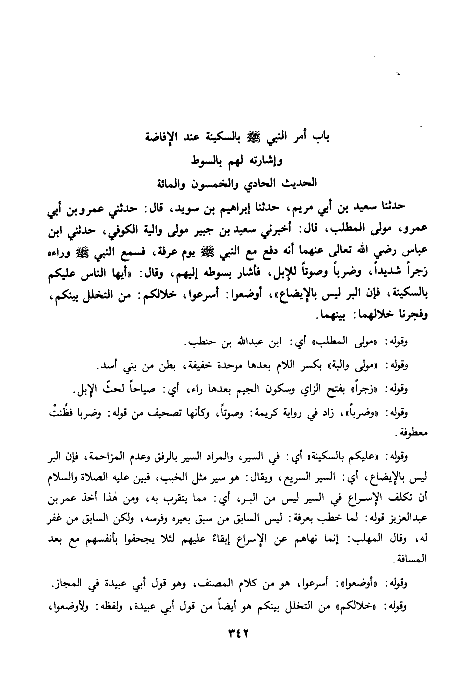 حَدَّثَنَا سَعِيدُ بْنُ أَبِي مَرْيَمَ، حَدَّثَنَا إِبْرَاهِيمُ بْنُ سُوَيْدٍ، قال: حَدَّثَنِي عَمْرُو بْنُ أَبِي عَمْرٍو، مَوْلَى الْمُطَّلِبِ، قال: أَخْبَرَنِي سَعِيدُ بْنُ جُبَيْرٍ مَوْلَى وَالِبَةَ الْكُوفِيُّ، حَدَّثَنِي ابْنُ عَبَّاسٍ رضي الله عنهما أَنَّهُ دَفَعَ مَعَ النَّبِيِّ -صلى الله عليه وسلم- يَوْمَ عَرَفَةَ، فَسَمِعَ النَّبِيُّ -صلى الله عليه وسلم- وَرَاءَهُ زَجْرًا شَدِيدًا، وَضَرْبًا وَصَوْتًا لِلإِبِلِ، فَأَشَارَ بِسَوْطِهِ إِلَيْهِمْ، وَقَالَ: "أَيُّهَا النَّاسُ عَلَيْكُمْ بِالسَّكِينَةِ، فَإِنَّ الْبِرَّ لَيْسَ بِالإِيضَاعِ". أَوْضَعُوا: أَسْرَعُوا. خِلاَلَكُمْ: مِنَ التَّخَلُّلِ بَيْنَكُمْ، وَفَجَّرْنَا خِلاَلَهُمَا: بَيْنَهُمَا.