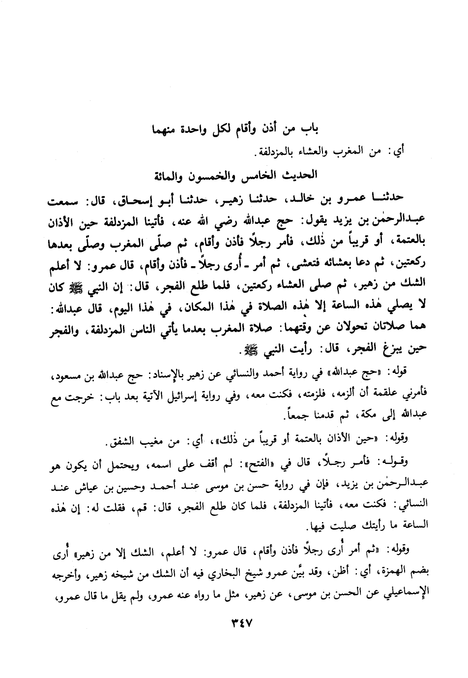حَدَّثَنَا عَمْرُو بْنُ خَالِدٍ، حَدَّثَنَا زُهَيْرٌ، حَدَّثَنَا أَبُو إِسْحَاقَ، قَالَ: سَمِعْتُ عَبْدَ الرَّحْمَنِ بْنَ يَزِيدَ يَقُولُ: حَجَّ عَبْدُ اللَّهِ رضي الله عنه، فَأَتَيْنَا الْمُزْدَلِفَةَ حِينَ الأَذَانِ بِالْعَتَمَةِ، أَوْ قَرِيبًا مِنْ ذَلِكَ، فَأَمَرَ رَجُلاً فَأَذَّنَ وَأَقَامَ، ثُمَّ صَلَّى الْمَغْرِبَ، وَصَلَّى بَعْدَهَا رَكْعَتَيْنِ، ثُمَّ دَعَا بِعَشَائِهِ فَتَعَشَّى، ثُمَّ أَمَرَ -أُرَى رَجُلاً- فَأَذَّنَ وَأَقَامَ، قَالَ عَمْرٌو: لاَ أَعْلَمُ الشَّكَّ إِلاَّ مِنْ زُهَيْرٍ، ثُمَّ صَلَّى الْعِشَاءَ رَكْعَتَيْنِ، فَلَمَّا طَلَعَ الْفَجْرُ، قَالَ: إِنَّ النَّبِيَّ -صلى الله عليه وسلم- كَانَ لاَ يُصَلِّي هَذِهِ السَّاعَةَ إِلاَّ هَذِهِ الصَّلاَةَ، فِي هَذَا الْمَكَانِ، مِنْ هَذَا الْيَوْمِ. قَالَ عَبْدُ اللَّهِ: هُمَا صَلاَتَانِ تُحَوَّلاَنِ عَنْ وَقْتِهِمَا: صَلاَةُ الْمَغْرِبِ بَعْدَمَا يَأْتِي النَّاسُ الْمُزْدَلِفَةَ، وَالْفَجْرُ حِينَ يَبْزُغُ الْفَجْرُ. قَالَ رَأَيْتُ النَّبِيَّ -صلى الله عليه وسلم- يَفْعَلُهُ.