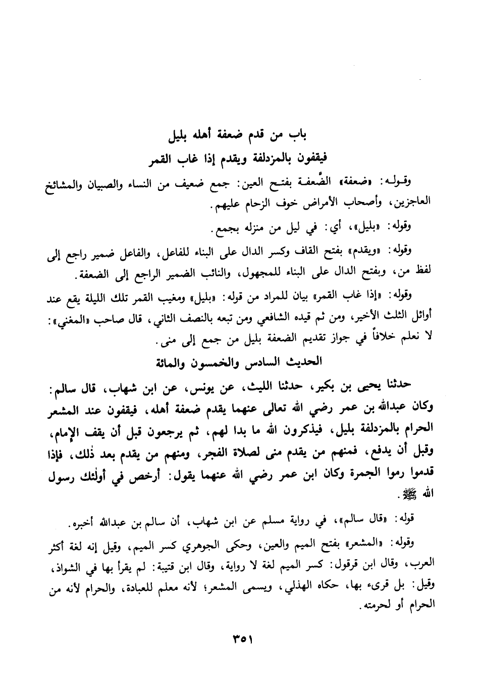 حَدَّثَنَا يَحْيَى بْنُ بُكَيْرٍ، حَدَّثَنَا اللَّيْثُ، عَنْ يُونُسَ، عَنِ ابْنِ شِهَابٍ، قَالَ سَالِمٌ: وَكَانَ عَبْدُ اللَّهِ بْنُ عُمَرَ رضي الله عنهما يُقَدِّمُ ضَعَفَةَ أَهْلِهِ، فَيَقِفُونَ عِنْدَ الْمَشْعَرِ الْحَرَامِ بِالْمُزْدَلِفَةِ بِلَيْلٍ، فَيَذْكُرُونَ اللَّهَ مَا بَدَا لَهُمْ، ثُمَّ يَرْجِعُونَ قَبْلَ أَنْ يَقِفَ الإِمَامُ، وَقَبْلَ أَنْ يَدْفَعَ، فَمِنْهُمْ مَنْ يَقْدَمُ مِنًى لِصَلاَةِ الْفَجْرِ، وَمِنْهُمْ مَنْ يَقْدَمُ بَعْدَ ذَلِكَ، فَإِذَا قَدِمُوا رَمَوُا الْجَمْرَةَ، وَكَانَ ابْنُ عُمَرَ رضي الله عنهما يَقُولُ: أَرْخَصَ فِي أُولَئِكَ رَسُولُ اللَّهِ -صلى الله عليه وسلم-.