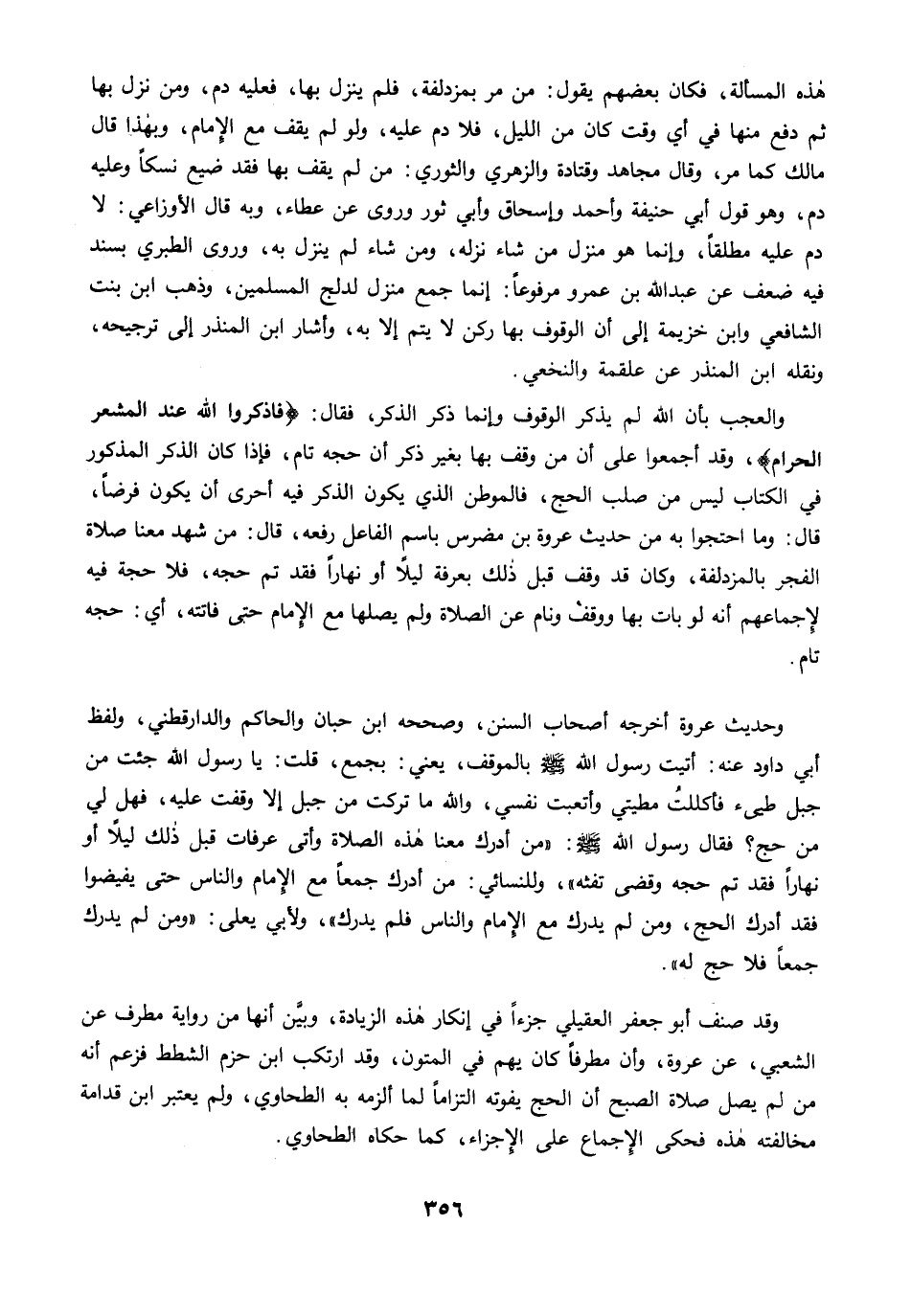 وقد صنف أبو جعفر العقيلي جزءًا في إنكار هذه الزيادة، وبيَّن أنها من رواية مطرف عن الشعبي، عن عروة، وأن مطرفًا كان يهم في المتون، وقد ارتكب ابن حزم الشطط فزعم أنه من لم يصل صلاة الصبح أن الحج يفوته التزامًا لما ألزمه به الطحاوي، ولم يعتبر ابن قدامة مخالفته هذه فحكى الإجماع على الإجزاء، كما حكاه الطحاوي.