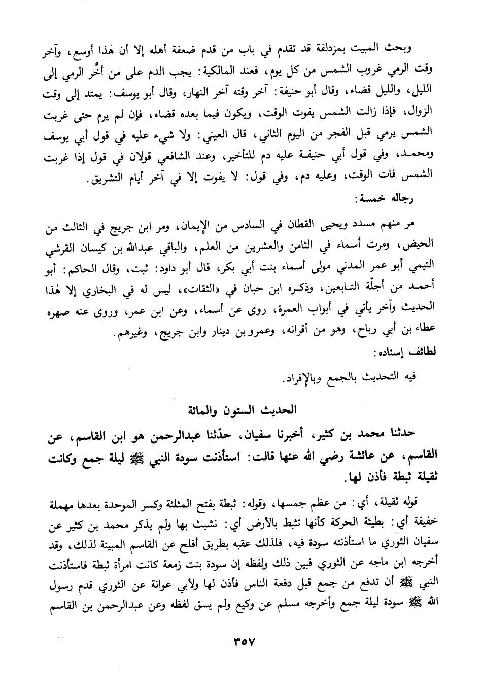 حَدَّثَنَا مُحَمَّدُ بْنُ كَثِيرٍ، أَخْبَرَنَا سُفْيَانُ، حَدَّثَنَا عَبْدُ الرَّحْمَنِ هُوَ ابْنُ الْقَاسِمِ، عَنِ الْقَاسِمِ، عَنْ عَائِشَةَ رضي الله عنها قَالَتِ: اسْتَأْذَنَتْ سَوْدَةُ النَّبِيَّ -صلى الله عليه وسلم- لَيْلَةَ جَمْعٍ وَكَانَتْ ثَقِيلَةً ثَبْطَةً فَأَذِنَ لَهَا.