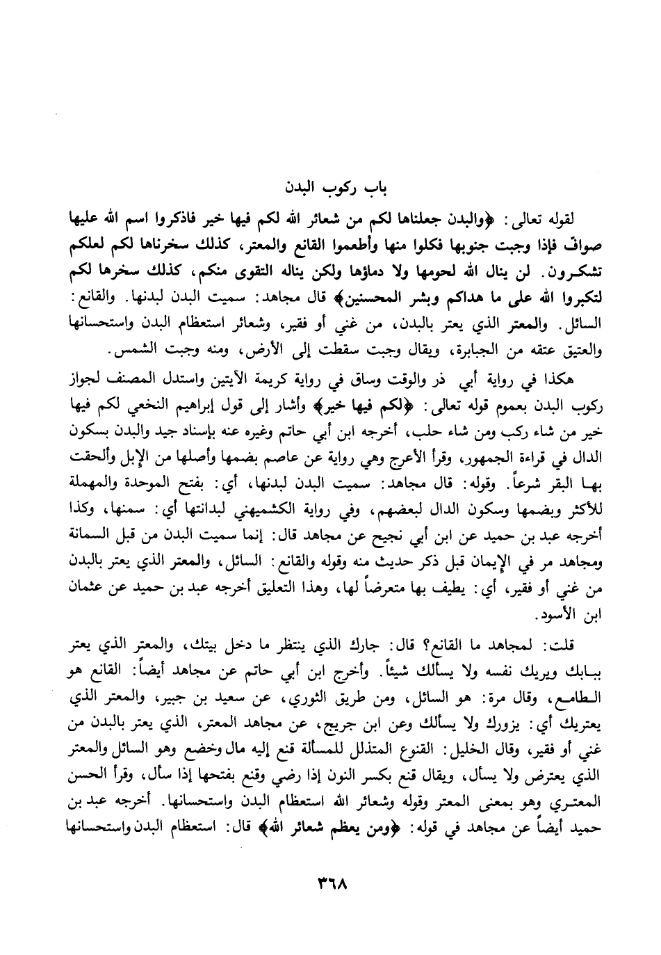 هكذا في رواية أبي ذر والوقت وساق في رواية كريمة الآيتين واستدل المصنف لجواز ركوب البدن بعموم قوله تعالى: {لَكُمْ فِيهَا خَيْرٌ} وأشار إلى قول إبراهيم النخعي لكم فيها خير من شاء ركب ومن شاء حلب، أخرجه ابن أبي حاتم وغيره عنه بإسناد جيد والبدن بسكون الدال في قراءة الجمهور، وقرأ الأعرج وهي رواية عن عاصم بضمها وأصلها من الإبل وألحقت بها البقر شرعًا. وقوله: قال مجاهد: سميت البدن لبدنها، أي: بفتح الموحدة والمهملة للأكثر وبضمها وسكون الدال لبعضهم، وفي رواية الكشميهني لبدانتها أي: سمنها، وكذا أخرجه عبد بن حميد عن ابن أبي نجيح عن مجاهد قال: إنما سميت البدن من قبل السمانة ومجاهد مرَّ في الإيمان قبل ذكر حديث منه وقوله والقانع: السائل، والمعتر الذي يعتر بالبدن من غني أو فقير، أي: يطيف بها متعرضًا لها، وهذا التعليق أخرجه عبد بن حميد عن عثمان ابن الأسود.