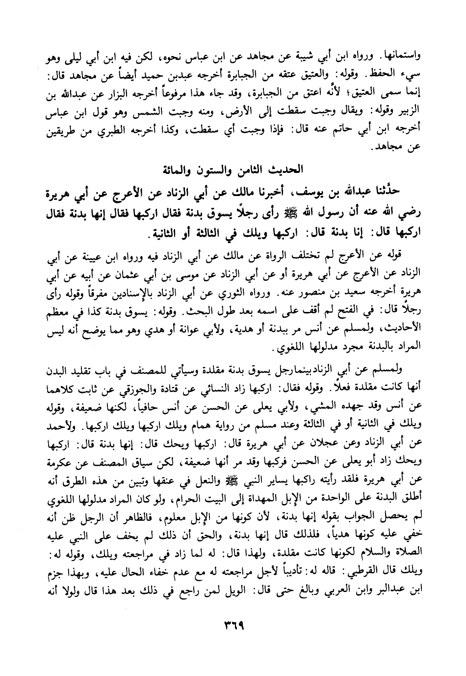 قوله عن الأعرج لم تختلف الرواة عن مالك عن أبي الزناد فيه ورواه ابن عيينة عن أبي الزناد عن الأعرج عن أبي هريرة أو عن أبي الزناد عن موسى بن أبي عثمان عن أبيه عن أبي هريرة أخرجه سعيد بن منصور عنه. ورواه الثوري عن أبي الزناد بالإسنادين مفرقًا وقوله رأى رجلًا قال: في الفتح لم أقف على اسمه بعد طول البحث. وقوله: يسوق بدنة كذا في معظم الأحاديث، ولمسلم عن أنس مرَّ ببدنة أو هدية، ولأبي عوانة أو هدي وهو مما يوضح أنه ليس المراد بالبدنة مجرد مدلولها اللغوي.