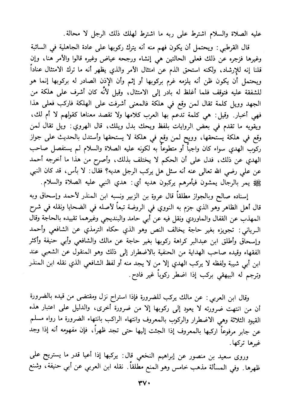 وقال ابن العربي: عن مالك يركب للضرورة فإذا استراح نزل ومقتضى من قيده بالضرورة أن من انتهت ضرورته لا يعود إلى ركوبها إلا من ضرورة أخرى، والدليل على اعتبار هذه القيود الثلاثة وهي الاضطرار والركوب بالمعروف وانتهاء الراكب بانتهاء الضرورة ما رواه مسلم عن جابر مرفوعًا اركبها بالمعروف إذا الجئت إليها حتى تجد ظهرًا، فإن مفهومه أنه إذا وجد غيرها تركها.