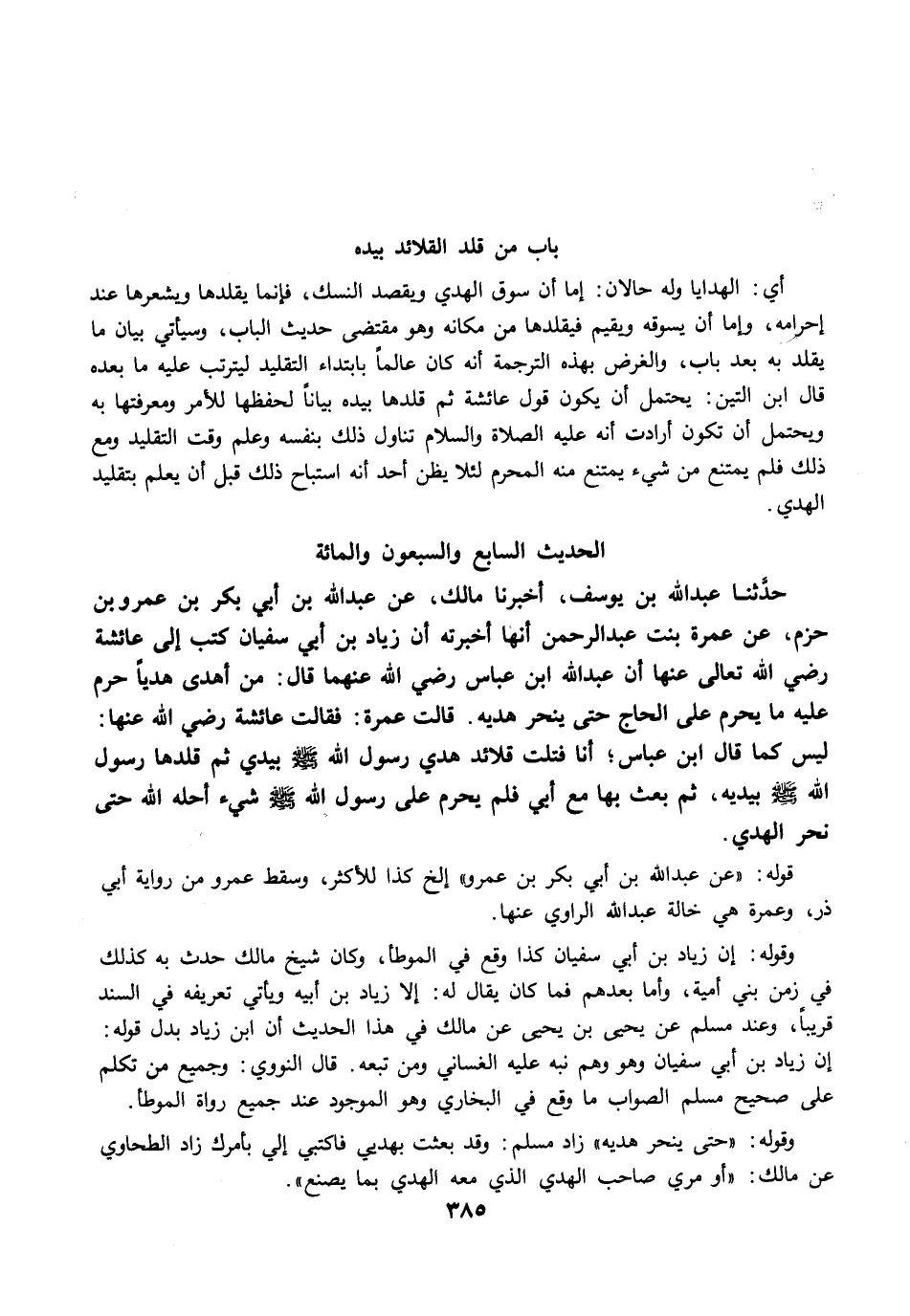 حَدَّثَنَا عَبْدُ اللَّهِ بْنُ يُوسُفَ، أَخْبَرَنَا مَالِكٌ، عَنْ عَبْدِ اللَّهِ بْنِ أَبِي بَكْرِ بْنِ عَمْرِو بْنِ حَزْمٍ، عَنْ عَمْرَةَ بِنْتِ عَبْدِ الرَّحْمَنِ أَنَّهَا أَخْبَرَتْهُ أَنَّ زِيَادَ بْنَ أَبِي سُفْيَانَ كَتَبَ إِلَى عَائِشَةَ رضي الله عنها إِنَّ عَبْدَ اللَّهِ بْنَ عَبَّاسٍ رضي الله عنهما قَالَ: مَنْ أَهْدَى هَدْيًا حَرُمَ عَلَيْهِ مَا يَحْرُمُ عَلَى الْحَاجِّ حَتَّى يُنْحَرَ هَدْيُهُ. قَالَتْ عَمْرَةُ: فَقَالَتْ عَائِشَةُ رضي الله عنها: لَيْسَ كَمَا قَالَ ابْنُ عَبَّاسٍ، أَنَا فَتَلْتُ قَلاَئِدَ هَدْي رَسُولِ اللَّهِ -صلى الله عليه وسلم- بِيَدَيَّ، ثُمَّ قَلَّدَهَا رَسُولُ اللَّهِ -صلى الله عليه وسلم- بِيَدَيْهِ، ثُمَّ بَعَثَ بِهَا مَعَ أَبِي فَلَمْ يَحْرُمْ عَلَى رَسُولِ اللَّهِ -صلى الله عليه وسلم- شَيْءٌ أَحَلَّهُ اللَّهُ حَتَّى نُحِرَ الْهَدْيُ.