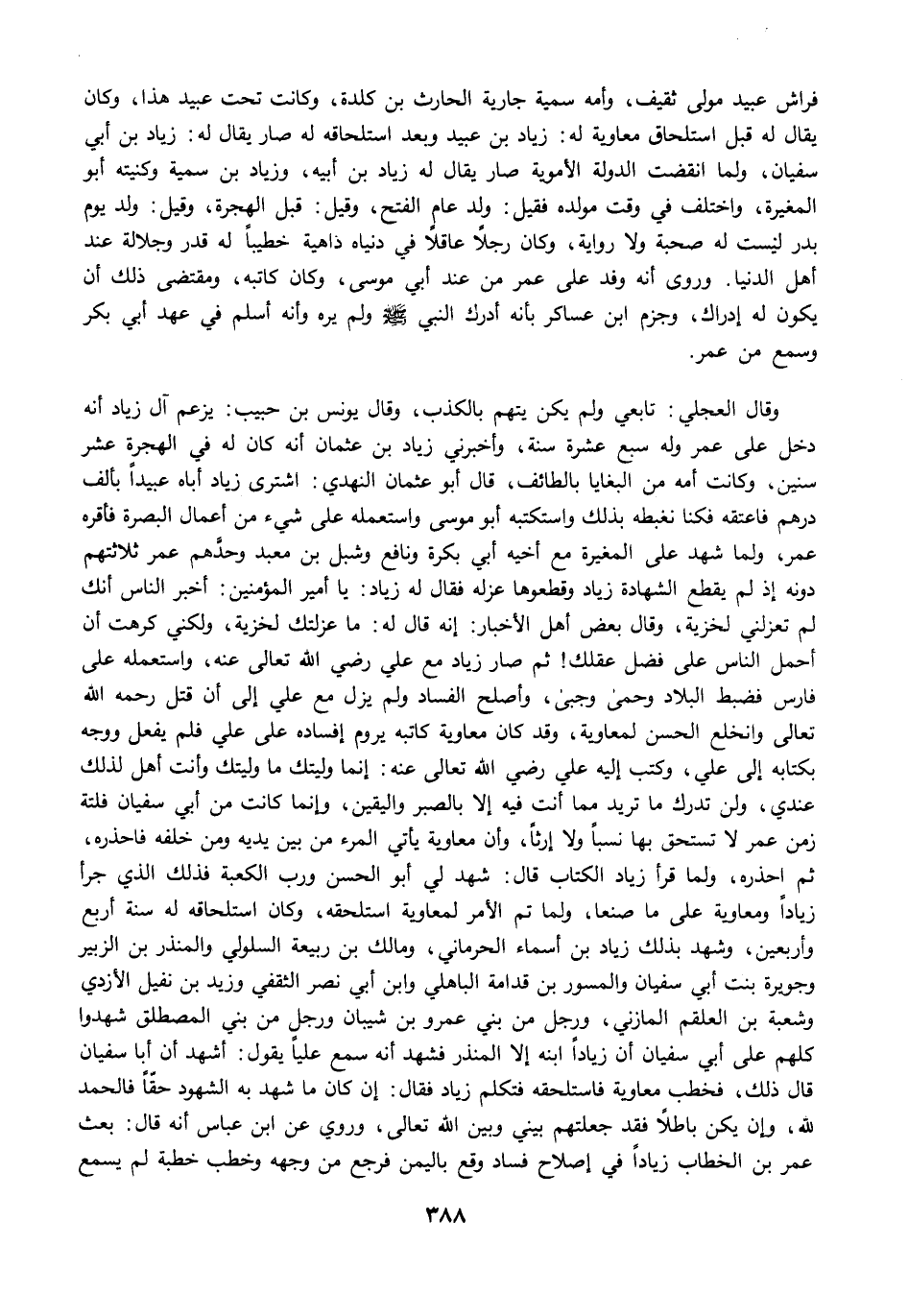 وقال العجلي: تابعي ولم يكن يتهم بالكذب، وقال يونس بن حبيب: يزعم آل زياد أنه دخل على عمر وله سبع عشرة سنة، وأخبرني زياد بن عثمان أنه كان له في الهجرة عشر سنين، وكانت أمه من البغايا بالطائف، قال أبو عثمان النهدي: اشترى زياد أباه عبيدًا بألف درهم فاعتقه فكنا نغبطه بذلك واستكتبه أبو موسى واستعمله على شيء من أعمال البصرة فأقره عمر، ولما شهد على المغيرة مع أخيه أبي بكرة ونافع وشبل بن معبد وحدَّهم عمر ثلاثتهم دونه إذ لم يقطع الشهادة زياد وقطعوها عزله فقال له زياد: يا أمير المؤمنين: أخبر الناس أنك لم تعزلني لخزية، وقال بعض أهل الأخبار: إنه قال له: ما عزلتك لخزية، ولكني كرهت أن أحمل الناس على فضل عقلك! ثم صار زياد مع علي رضي الله تعالى عنه، واستعمله على فارس فضبط البلاد وحمى وجبى، وأصلح الفساد ولم يزل مع علي إلى أن قتل رحمه الله تعالى وانخلع الحسن لمعاوية، وقد كان معاوية كاتبه يروم إفساده على علي فلم يفعل ووجه بكتابه إلى علي، وكتب إليه علي رضي الله تعالى عنه: إنما وليتك ما وليتك وأنت أهل لذلك عندي، ولن تدرك ما تريد مما أنت فيه إلا بالصبر واليقين، وإنما كانت من أبي سفيان فلتة زمن عمر لا تستحق بها نسبًا ولا إرثًا، وأن معاوية يأتي المرء من بين يديه ومن خلفه فاحذره، ثم احذره، ولما قرأ زياد الكتاب قال: شهد لي أبو الحسن ورب الكعبة فذلك الذي جرأ زيادًا ومعاوية على ما صنعا، ولما تم الأمر لمعاوية استلحقه، وكان استلحاقه له سنة أربع وأربعين، وشهد بذلك زياد بن أسماء الحرماني، ومالك بن ربيعة السلولي والمنذر بن الزبير وجويرة بنت أبي سفيان والمسور بن قدامة الباهلي وابن أبي نصر الثقفي وزيد بن نفيل الأزدي وشعبة بن العلقم المازني، ورجل من بني عمرو بن شيبان ورجل من بني المصطلق شهدوا كلهم على أبي سفيان أن زيادًا ابنه إلا المنذر فشهد أنه سمع عليًا يقول: أشهد أن أبا سفيان قال ذلك، فخطب معاوية فاستلحقه فتكلم زياد فقال: إن كان ما شهد به الشهود حقًّا فالحمد لله، وإن يكن باطلًا فقد جعلتهم بيني وبين الله تعالى، وروي عن ابن عباس أنه قال: بعث عمر بن الخطاب زيادًا في إصلاح فساد وقع باليمن فرجع من وجهه وخطب خطبة لم يسمع