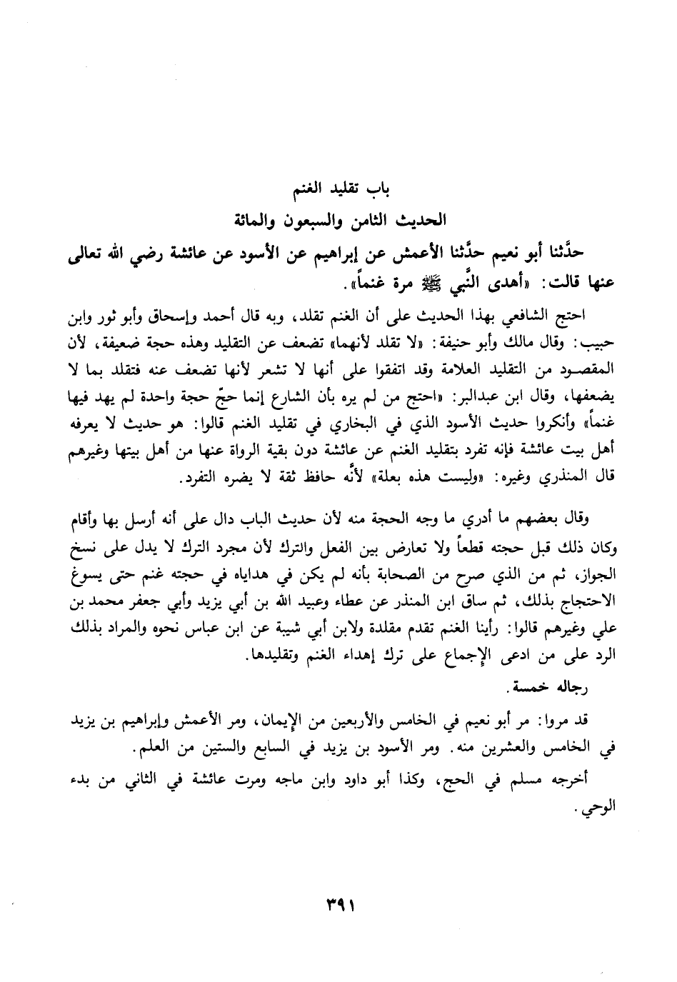 احتج الشافعي بهذا الحديث على أن الغنم تقلد، وبه قال أحمد وإسحاق وأبو ثور وابن حبيب: وقال مالك وأبو حنيفة: "لا تقلد لأنهما" تضعف عن التقليد وهذه حجة ضعيفة؛ لأن المقصود من التقليد العلامة وقد اتفقوا على أنها لا تشعر لأنها تضعف عنه فتقلد بما لا يضعفها، وقال ابن عبد البر: "احتج من لم يره بأن الشارع إنما حج حجة واحدة لم يهد فيها غنمًا" وأنكروا حديث الأسود الذي في البخاري في تقليد الغنم قالوا: هو حديث لا يعرفه أهل بيت عائشة فإنه تفرد بتقليد الغنم عن عائشة دون بقية الرواة عنها من أهل بيتها وغيرهم قال المنذري وغيره: "وليست هذه بعلة" لأنه حافظ ثقة لا يضره التفرد.