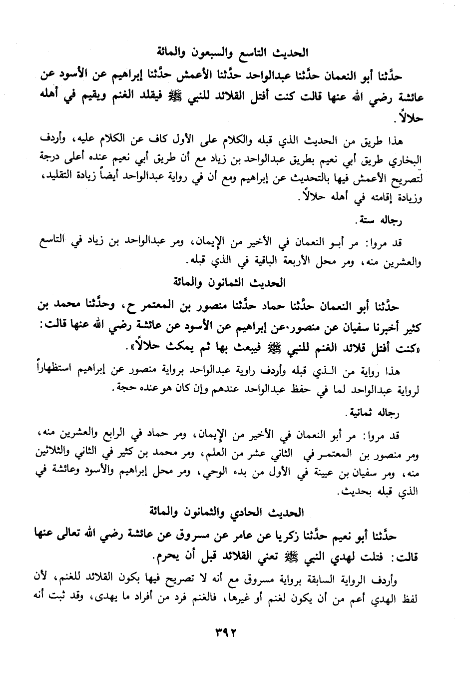 حَدَّثَنَا أَبُو النُّعْمَانِ حَدَّثَنَا حَمَّادٌ حَدَّثَنَا مَنْصُورُ بْنُ الْمُعْتَمِرِ ح، وَحَدَّثَنَا مُحَمَّدُ بْنُ كَثِيرٍ أَخْبَرَنَا سُفْيَانُ عَنْ مَنْصُورٍ عَنْ إِبْرَاهِيمَ عَنِ الأَسْوَدِ عَنْ عَائِشَةَ رضي الله عنها قَالَتْ: "كُنْتُ أَفْتِلُ قَلاَئِدَ الْغَنَمِ لِلنَّبِيِّ -صلى الله عليه وسلم- فَيَبْعَثُ بِهَا، ثُمَّ يَمْكُثُ حَلاَلاً".