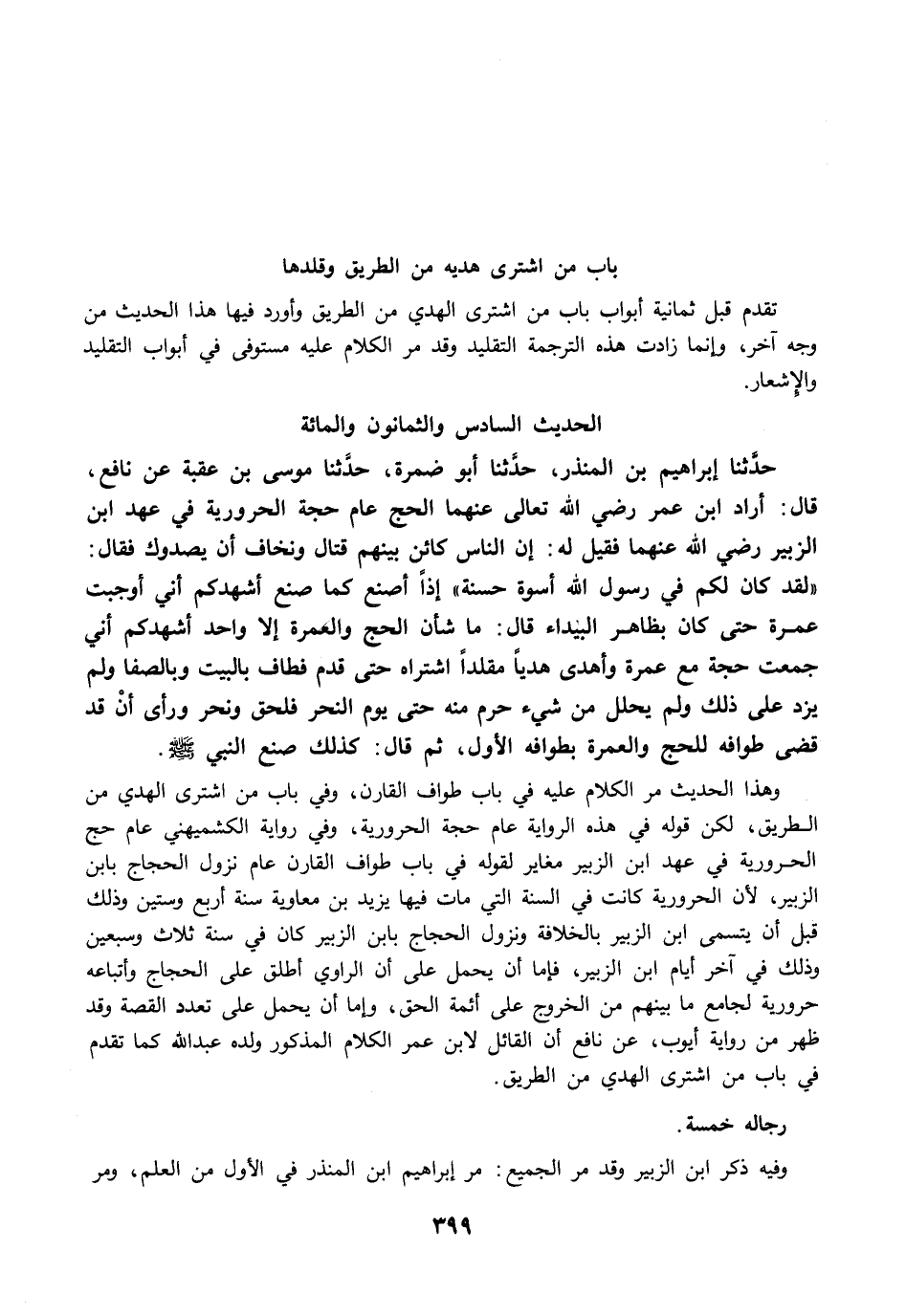 حَدَّثَنَا إِبْرَاهِيمُ بْنُ الْمُنْذِرِ، حَدَّثَنَا أَبُو ضَمْرَةَ، حَدَّثَنَا مُوسَى بْنُ عُقْبَةَ عَنْ نَافِعٍ، قَالَ: أَرَادَ ابْنُ عُمَرَ رضي الله عنهما الْحَجَّ عَامَ حَجَّةِ الْحَرُورِيَّةِ فِي عَهْدِ ابْنِ الزُّبَيْرِ رضي الله عنهما فَقِيلَ لَهُ: إِنَّ النَّاسَ كَائِنٌ بَيْنَهُمْ قِتَالٌ، وَنَخَافُ أَنْ يَصُدُّوكَ. فَقَالَ: "لَقَدْ كَانَ لَكُمْ فِي رَسُولِ اللَّهِ أُسْوَةٌ حَسَنَةٌ" إِذًا أَصْنَعَ كَمَا صَنَعَ، أُشْهِدُكُمْ أَنِّي أَوْجَبْتُ عُمْرَةً. حَتَّى كَانَ بِظَاهِرِ الْبَيْدَاءِ قَالَ: مَا شَأْنُ الْحَجِّ وَالْعُمْرَةِ إِلاَّ وَاحِدٌ، أُشْهِدُكُمْ أَنِّي جَمَعْتُ حَجَّةً مَعَ عُمْرَةٍ. وَأَهْدَى هَدْيًا مُقَلَّدًا اشْتَرَاهُ حَتَّى قَدِمَ، فَطَافَ بِالْبَيْتِ وَبِالصَّفَا، وَلَمْ يَزِدْ عَلَى ذَلِكَ، وَلَمْ يَحْلِلْ مِنْ شَيْءٍ حَرُمَ مِنْهُ حَتَّى يَوْمِ النَّحْرِ، فَحَلَقَ وَنَحَرَ وَرَأَى أَنْ قَدْ قَضَى طَوَافَهُ الْحَجَّ وَالْعُمْرَةَ بِطَوَافِهِ الأَوَّلِ، ثُمَّ قَالَ: كَذَلِكَ صَنَعَ النَّبِيُّ -صلى الله عليه وسلم-.