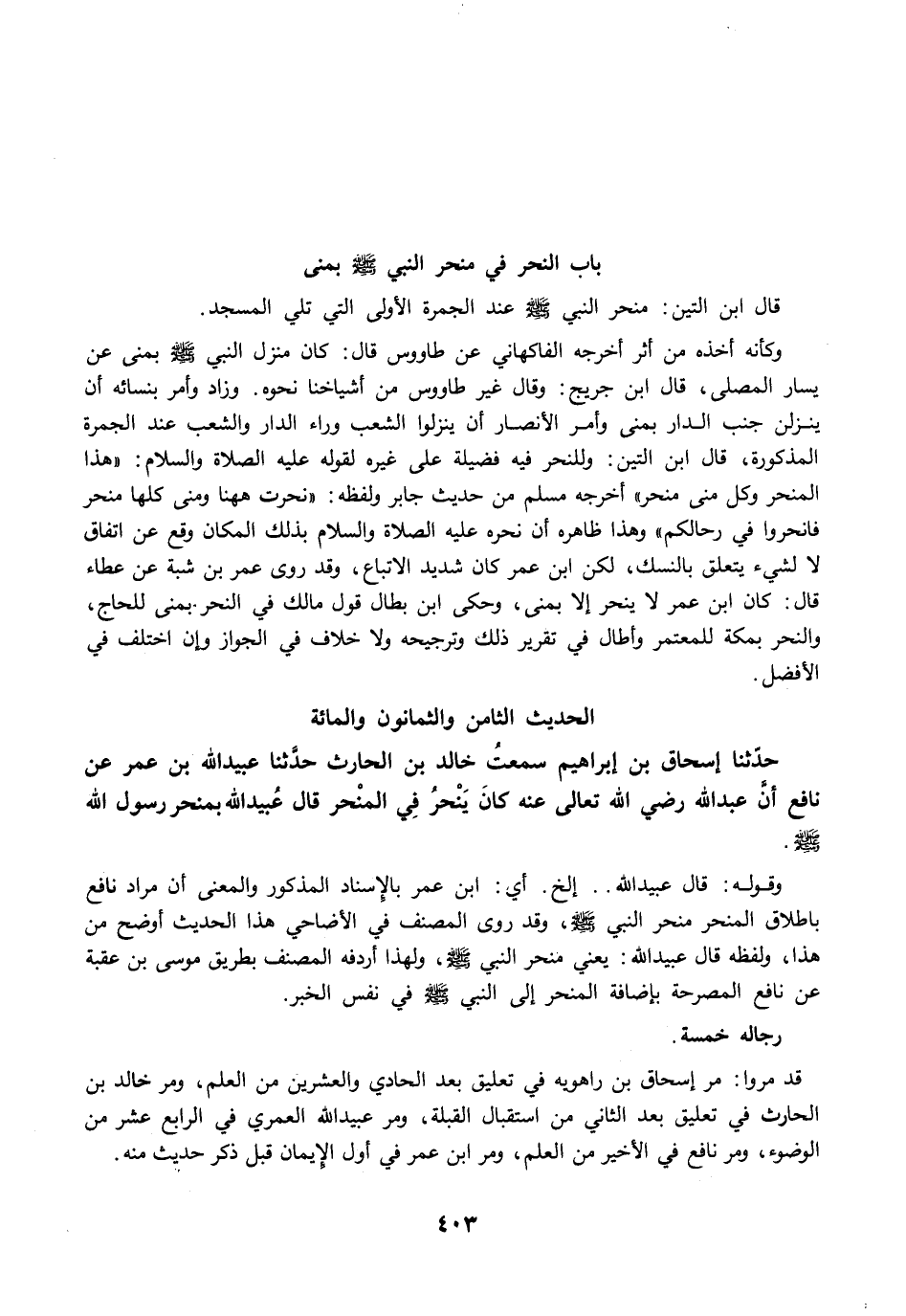 حَدَّثَنَا إِسْحَاقُ بْنُ إِبْرَاهِيمَ سَمِعتُ خَالِدَ بْنَ الْحَارِثِ حَدَّثَنَا عُبَيْدُ اللَّهِ بْنُ عُمَرَ عَنْ نَافِعٍ أَنَّ عَبْدَ اللَّهِ رضي الله عنه كَانَ يَنْحَرُ فِي الْمَنْحَرِ. قَالَ عُبَيْدُ اللَّهِ مَنْحَرِ رَسُولِ اللَّهِ -صلى الله عليه وسلم-.