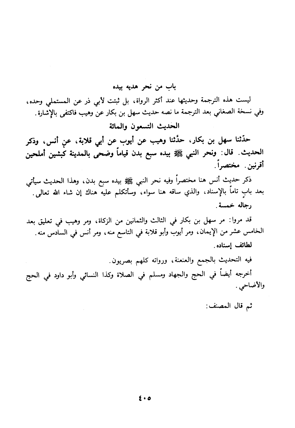 ذكر حديث أنس هنا مختصرًا وفيه نحر النبي -صلى الله عليه وسلم- بيده سبع بدن، وهذا الحديث سيأتي بعد بابٍ تامًا بالإسناد، والذي ساقه هنا سواء، وسأتكلم عليه هناك إن شاء الله تعالى.