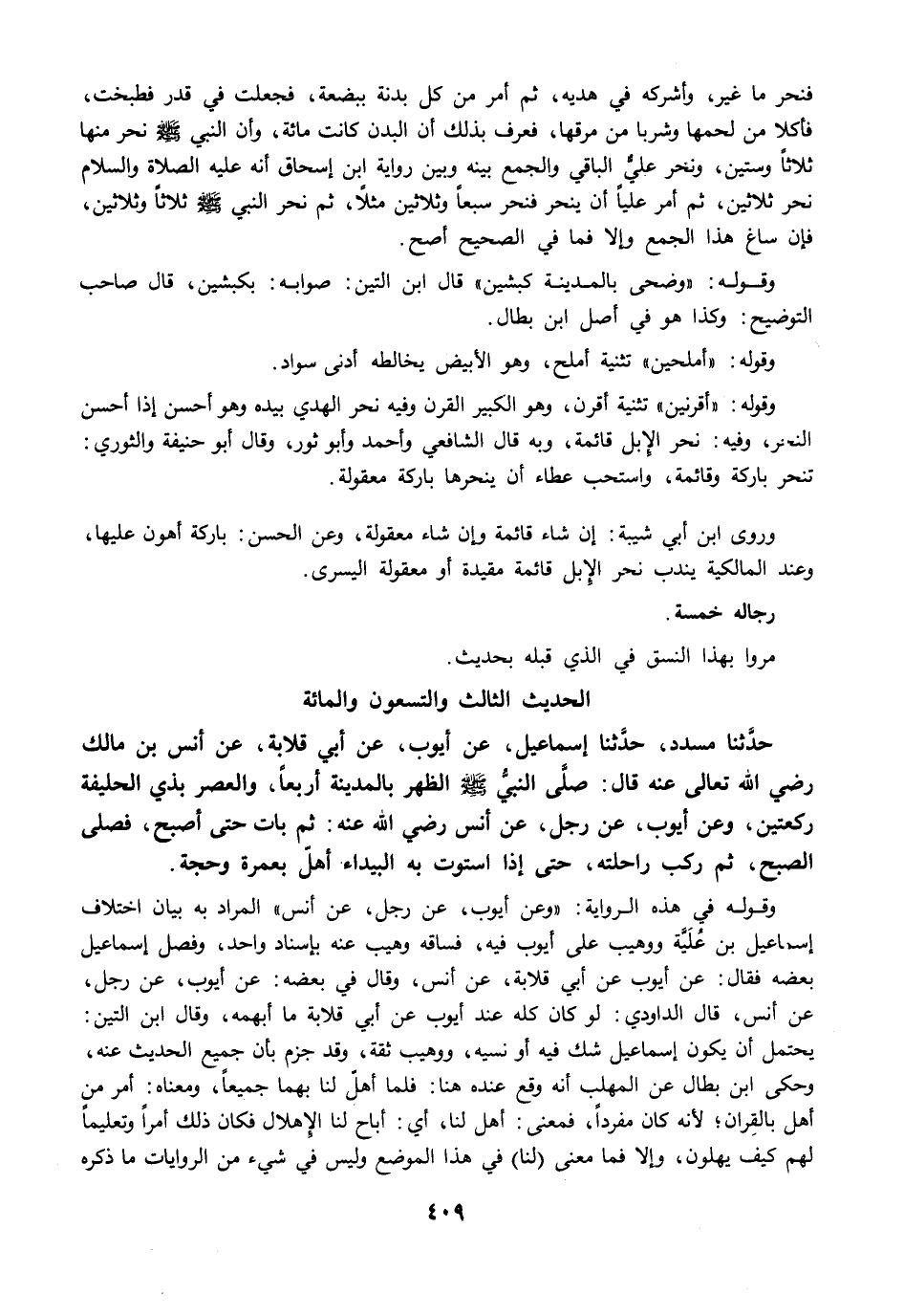 وقوله: "وضحى بالمدينة كبشين" قال ابن التين: صوابه: بكبشين، قال صاحب التوضيح: وكذا هو في أصل ابن بطال.