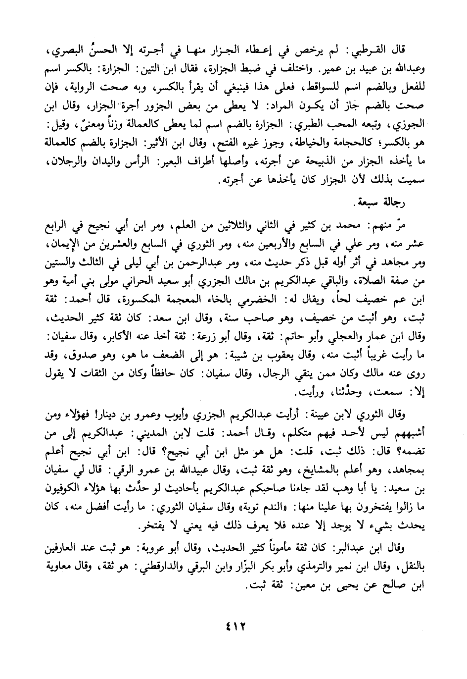 مرّ منهم: محمد بن كثير في الثاني والثلاثين من العلم، ومرَّ ابن أبي نجيح في الرابع عشر منه، ومرَّ علي في السابع والأربعين منه، ومرَّ الثوري في السابع والعشرين من الإيمان، ومرَّ مجاهد في أثر أوله قبل ذكر حديث منه، ومرَّ عبد الرحمن بن أبي ليلى في الثالث والستين من صفة الصلاة، والباقي عبد الكريم بن مالك الجزري أبو سعيد الحراني مولى بني أمية وهو ابن عم خصيف لحًا، ويقال له: الخضرمي بالخاء المعجمة المكسورة، قال أحمد: ثقة ثبت، وهو أثبت من خصيف، وهو صاحب سنة، وقال ابن سعد: كان ثقة كثير الحديث، وقال ابن عمار والعجلي وأبو حاتم: ثقة، وقال أبو زرعة: ثقة أخذ عنه الأكابر، وقال سفيان: ما رأيت غريبًا أثبت منه، وقال يعقوب بن شيبة: هو إلى الضعف ما هو، وهو صدوق، وقد روى عنه مالك وكان ممن ينقي الرجال، وقال سفيان: كان حافظًا وكان من الثقات لا يقول إلا: سمعت، وحدَّثنا، ورأيت.