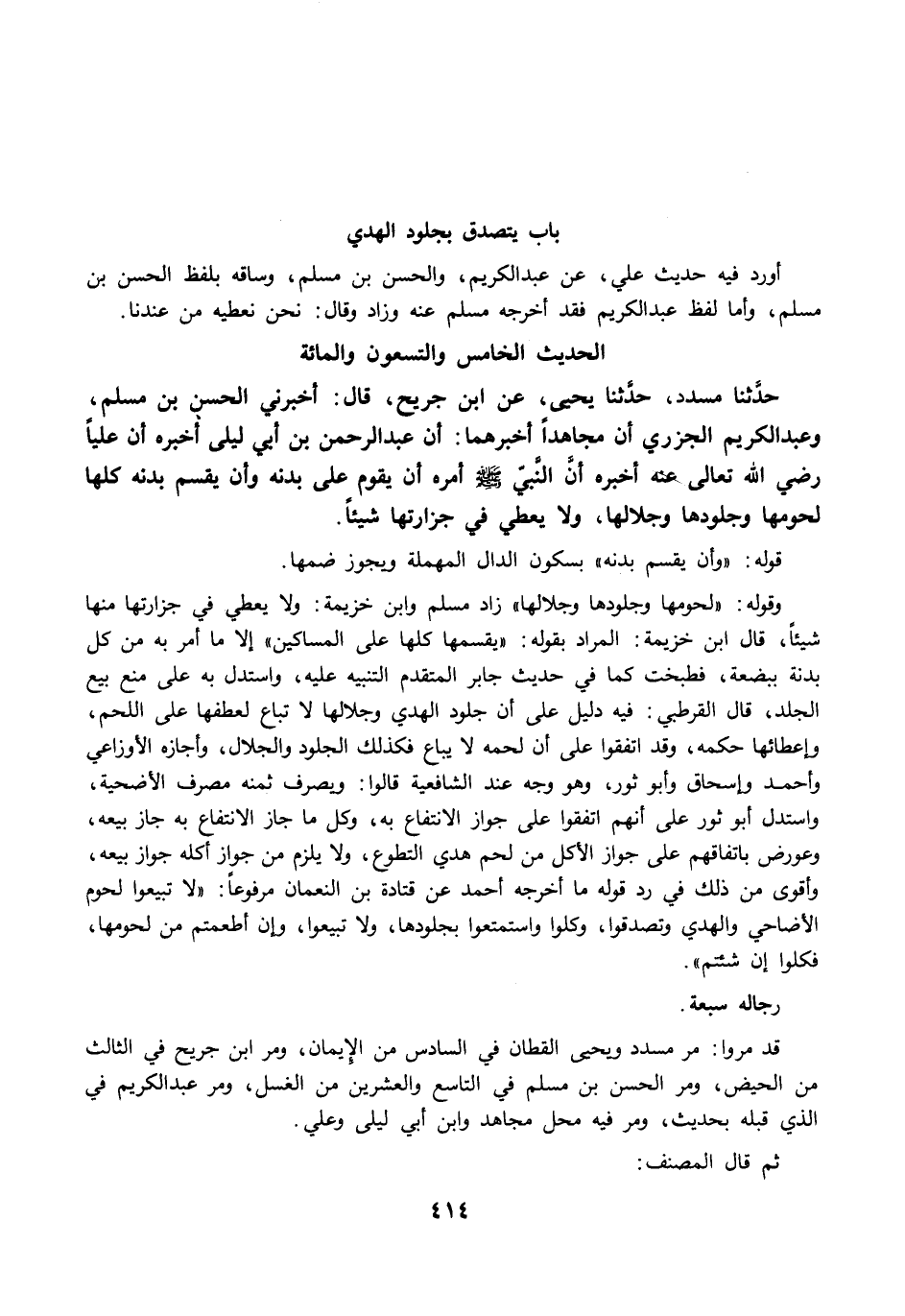 حَدَّثَنَا مُسَدَّدٌ، حَدَّثَنَا يَحْيَى، عَنِ ابْنِ جُرَيْجٍ، قَالَ: أَخْبَرَنِي الْحَسَنُ بْنُ مُسْلِمٍ، وَعَبْدُ الْكَرِيمِ الْجَزَرِيُّ أَنَّ مُجَاهِدًا أَخْبَرَهُمَا: أَنَّ عَبْدَ الرَّحْمَنِ بْنَ أَبِي لَيْلَى أَخْبَرَهُ أَنَّ عَلِيًّا رضي الله عنه أَخْبَرَهُ أَنَّ النَّبِيَّ -صلى الله عليه وسلم- أَمَرَهُ أَنْ يَقُومَ عَلَى بُدْنِهِ، وَأَنْ يَقْسِمَ بُدْنَهُ كُلَّهَا، لُحُومَهَا وَجُلُودَهَا وَجِلاَلَهَا، وَلاَ يُعْطِي فِي جِزَارَتِهَا شَيْئًا.