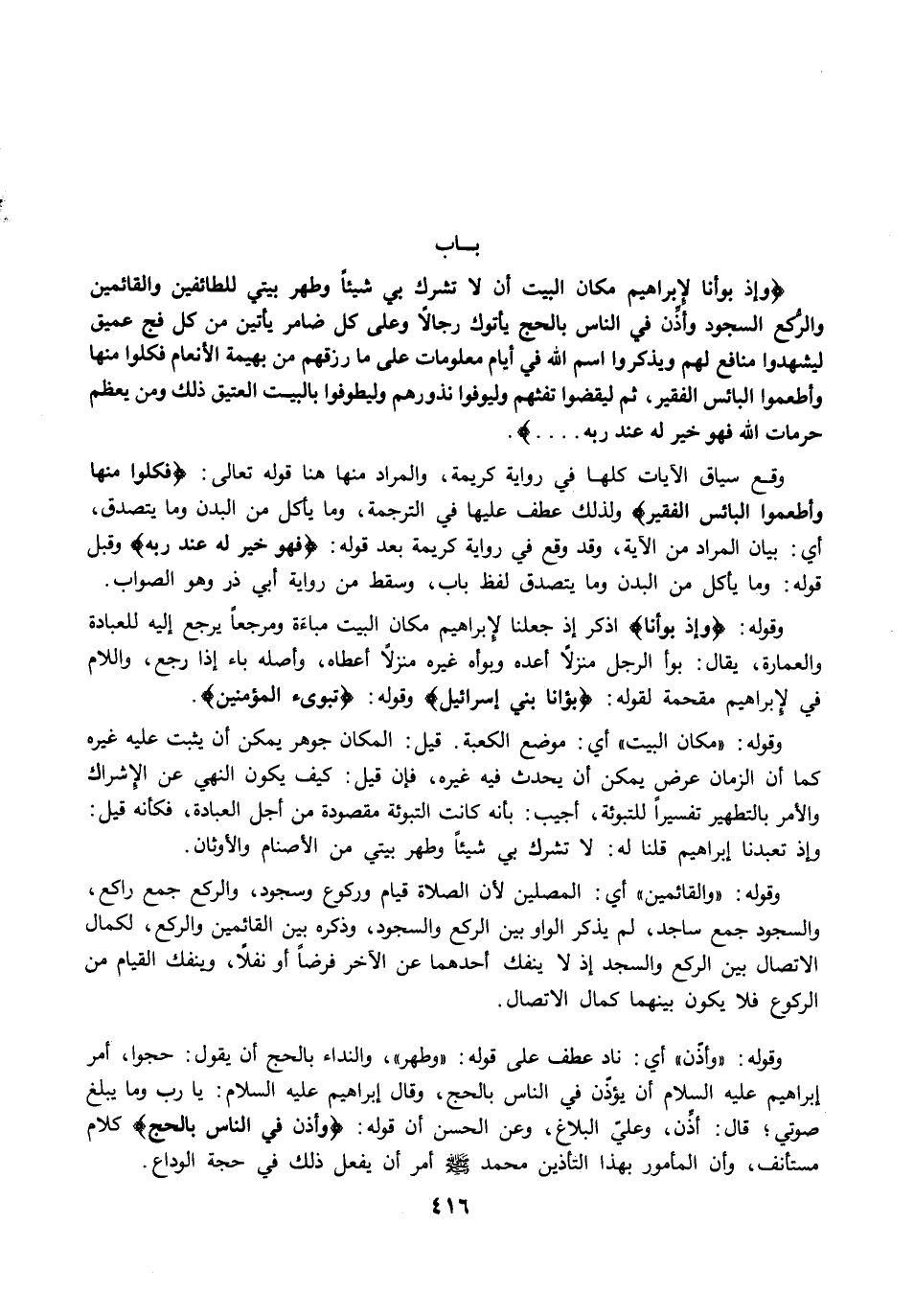 {وَإِذْ بَوَّأْنَا لِإِبْرَاهِيمَ مَكَانَ الْبَيْتِ أَنْ لَا تُشْرِكْ بِي شَيْئًا وَطَهِّرْ بَيْتِيَ لِلطَّائِفِينَ وَالْقَائِمِينَ وَالرُّكَّعِ السُّجُودِ (26) وَأَذِّنْ فِي النَّاسِ بِالْحَجِّ يَأْتُوكَ رِجَالًا وَعَلَى كُلِّ ضَامِرٍ يَأْتِينَ مِنْ كُلِّ فَجٍّ عَمِيقٍ (27) لِيَشْهَدُوا مَنَافِعَ لَهُمْ وَيَذْكُرُوا اسْمَ اللَّهِ فِي أَيَّامٍ مَعْلُومَاتٍ عَلَى مَا رَزَقَهُمْ مِنْ بَهِيمَةِ الْأَنْعَامِ فَكُلُوا مِنْهَا وَأَطْعِمُوا الْبَائِسَ الْفَقِيرَ (28) ثُمَّ لْيَقْضُوا تَفَثَهُمْ وَلْيُوفُوا نُذُورَهُمْ وَلْيَطَّوَّفُوا بِالْبَيْتِ الْعَتِيقِ (29) ذَلِكَ وَمَنْ يُعَظِّمْ حُرُمَاتِ اللَّهِ فَهُوَ خَيْرٌ لَهُ عِنْدَ رَبِّهِ ....}.