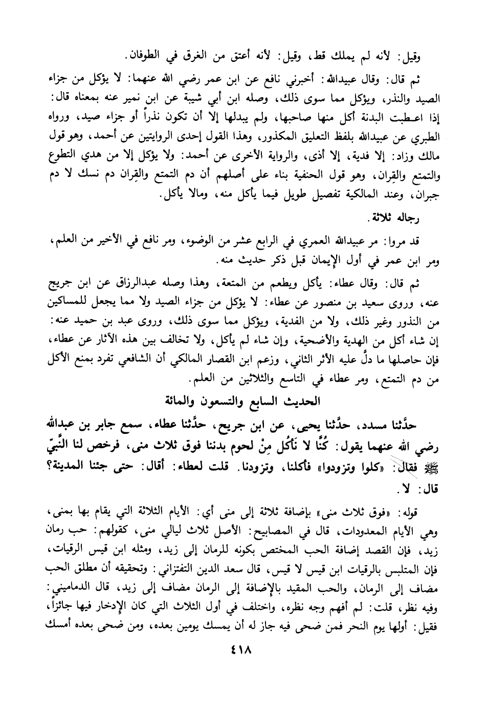 ثم قال: وقال عبيد الله: أخبرني نافع عن ابن عمر رضي الله عنهما: لا يؤكل من جزاء الصيد والنذر، ويؤكل مما سوى ذلك، وصله ابن أبي شيبة عن ابن نمير عنه بمعناه قال: إذا اعطبت البدنة أكل منها صاحبها، ولم يبدلها إلا أن تكون نذرًا أو جزاء صيد، ورواه الطبري عن عبيد الله بلفظ التعليق المذكور، وهذا القول إحدى الروايتين عن أحمد، وهو قول مالك وزاد: إلا فدية، إلا أذى، والرواية الأخرى عن أحمد: ولا يؤكل إلا من هدي التطوع والتمتع والقِران، وهو قول الحنفية بناء على أصلهم أن دم التمتع والقِران دم نسك لا دم جبران، وعند المالكية تفصيل طويل فيما يأكل منه، وما لا يأكل.