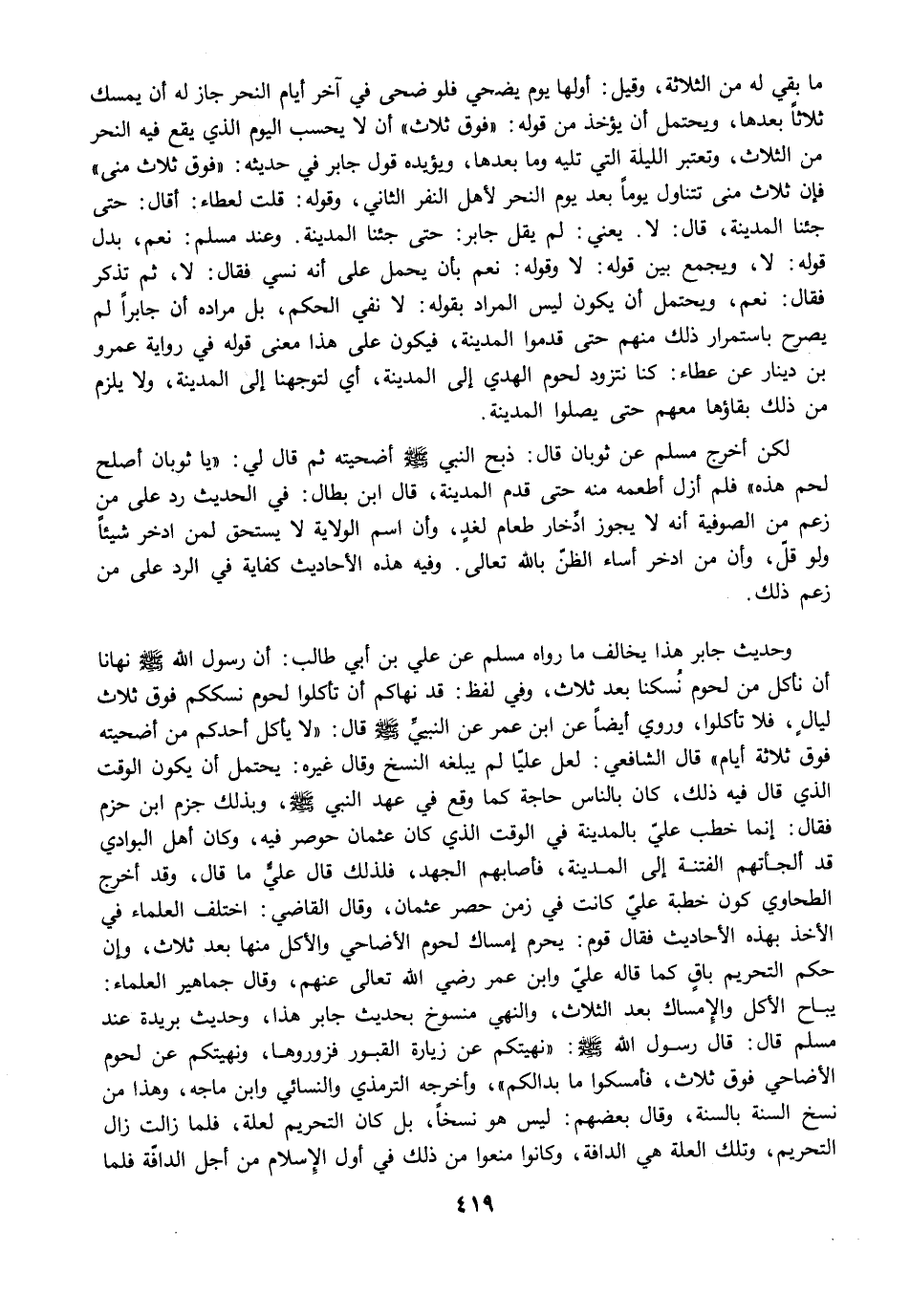 وحديث جابر هذا يخالف ما رواه مسلم عن علي بن أبي طالب: أن رسول الله -صلى الله عليه وسلم- نهانا أن نأكل من لحوم نُسكنا بعد ثلاث، وفي لفظ: قد نهاكم أن تأكلوا لحوم نسككم فوق ثلاث ليالٍ، فلا تأكلوا، وروي أيضًا عن ابن عمر عن النبيِّ -صلى الله عليه وسلم- قال: "لا يأكل أحدكم من أضحيته فوق ثلاثة أيام" قال الشافعي: لعل عليًّا لم يبلغه النسخ وقال غيره: يحتمل أن يكون الوقت الذي قال فيه ذلك، كان بالناس حاجة كما وقع في عهد النبي -صلى الله عليه وسلم-، وبذلك جزم ابن حزم فقال: إنما خطب عليّ بالمدينة في الوقت الذي كان عثمان حوصر فيه، وكان أهل البوادي قد ألجأتهم الفتنة إلى المدينة، فأصابهم الجهد، فلذلك قال عليّ ما قال، وقد أخرج الطحاوي كون خطبة عليّ كانت في زمن حصر عثمان، وقال القاضي: اختلف العلماء في الأخذ بهذه الأحاديث فقال قوم: يحرم إمساك لحوم الأضاحي والأكل منها بعد ثلاث، وإن حكم التحريم باقٍ كما قاله عليّ وابن عمر رضي الله تعالى عنهم، وقال جماهير العلماء: يباح الأكل والإمساك بعد الثلاث، والنهي منسوخ بحديث جابر هذا، وحديث بريدة عند مسلم قال: قال رسول الله -صلى الله عليه وسلم-: "نهيتكم عن زيارة القبور فزوروها، ونهيتكم عن لحوم الأضاحي فوق ثلاث، فأمسكوا ما بدا لكم"، وأخرجه الترمذي والنسائي وابن ماجه، وهذا من نسخ السنة بالسنة، وقال بعضهم: ليس هو نسخًا، بل كان التحريم لعلة، فلما زالت زال التحريم، وتلك العلة هي الدافة، وكانوا منعوا من ذلك في أول الإِسلام من أجل الدافّة فلما