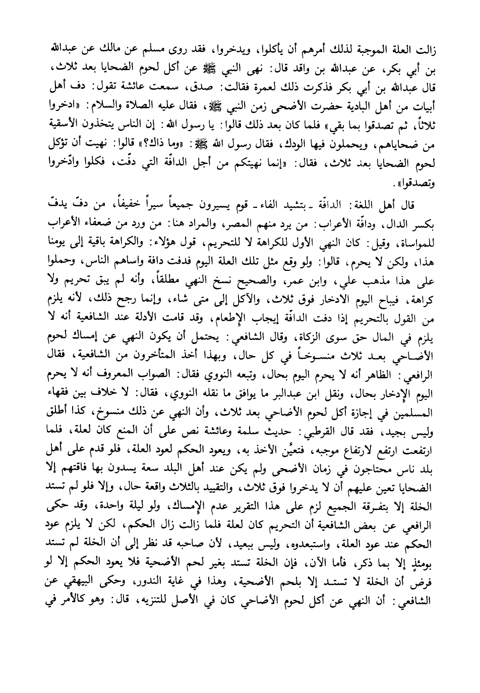 قال أهل اللغة: الدافّة -بتشيد الفاء- قوم يسيرون جميعًا سيرًا خفيفًا، من دفّ يدفّ بكسر الدال، ودافّة الأعراب: من يرد منهم المصر، والمراد هنا: من ورد من ضعفاء الأعراب للمواساة، وقيل: كان النهي الأول للكراهة لا للتحريم، قول هؤلاء: والكراهة باقية إلى يومنا هذا، ولكن لا يحرم، قالوا: ولو وقع مثل تلك العلة اليوم فدفت دافة واساهم الناس، وحملوا على هذا مذهب علي، وابن عمر، والصحيح نسخ النهي مطلقًا، وأنه لم يبق تحريم ولا كراهة، فيباح اليوم الادخار فوق ثلاث، والآكل إلى متى شاء، وإنما رجح ذلك؛ لأنه يلزم من القول بالتحريم إذا دفت الدافّة إيجاب الإطعام، وقد قامت الأدلة عند الشافعية أنه لا يلزم في المال حق سوى الزكاة، وقال الشافعي: يحتمل أن يكون النهي عن إمساك لحوم الأضاحي بعد ثلاث منسوخًا في كل حال، وبهذا أخذ المتأخرون من الشافعية، فقال الرافعي: الظاهر أنه لا يحرم اليوم بحال، وتبعه النووي فقال: الصواب المعروف أنه لا يحرم اليوم الإدخار بحال، ونقل ابن عبد البر ما يوافق ما نقله النووي، فقال: لا خلاف بين فقهاء المسلمين في إجازة أكل لحوم الأضاحي بعد ثلاث، وأن النهي عن ذلك منسوخ، كذا أطلق وليس بجيد، فقد قال القرطبي: حديث سلمة وعائشة نص على أن المنع كان لعلة، فلما ارتفعت ارتفع لارتفاع موجبه، فتعيَّن الأخذ به، ويعود الحكم لعود العلة، فلو قدم على أهل بلد ناس محتاجون في زمان الأضحى ولم يكن عند أهل البلد سعة يسدون بها فاقتهم إلا الضحايا تعين عليهم أن لا يدخروا فوق ثلاث، والتقييد بالثلاث واقعة حال، وإلا فلو لم تستد الخلة إلا بتفرقة الجميع لزم على هذا التقرير عدم الإمساك، ولو ليلة واحدة، وقد حكى الرافعي عن بعض الشافعية أن التحريم كان لعلة فلما زالت زال الحكم، لكن لا يلزم عود الحكم عند عود العلة، واستبعدوه، وليس ببعيد؛ لأن صاحبه قد نظر إلى أن الخلة لم تستد يومئذٍ إلا بما ذكر، فأما الآن، فإن الخلة تستد بغير لحم الأضحية فلا يعود الحكم إلا لو فرض أن الخلة لا تستد إلا بلحم الأضحية، وهذا في غاية الندور، وحكى البيهقي عن الشافعي: أن النهي عن أكل لحوم الأضاحي كان في الأصل للتنزيه، قال: وهو كالأمر في