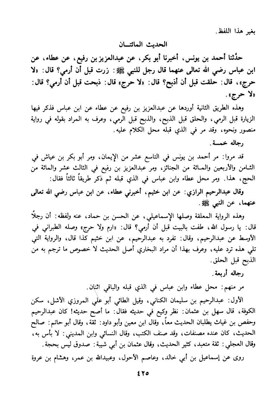 قد مرّوا: مرَّ أحمد بن يونس في التاسع عشر من الإيمان، ومرَّ أبو بكر بن عياش في الثامن والأربعين والمائة من الجنائز، ومرَّ عبد العزيز بن رفيع في الثالث عشر والمائة من الحج، هذا. ومرَّ محل عطاء وابن عباس في الذي قبله ثم ذكر طريقًا ثالثًا فقال: