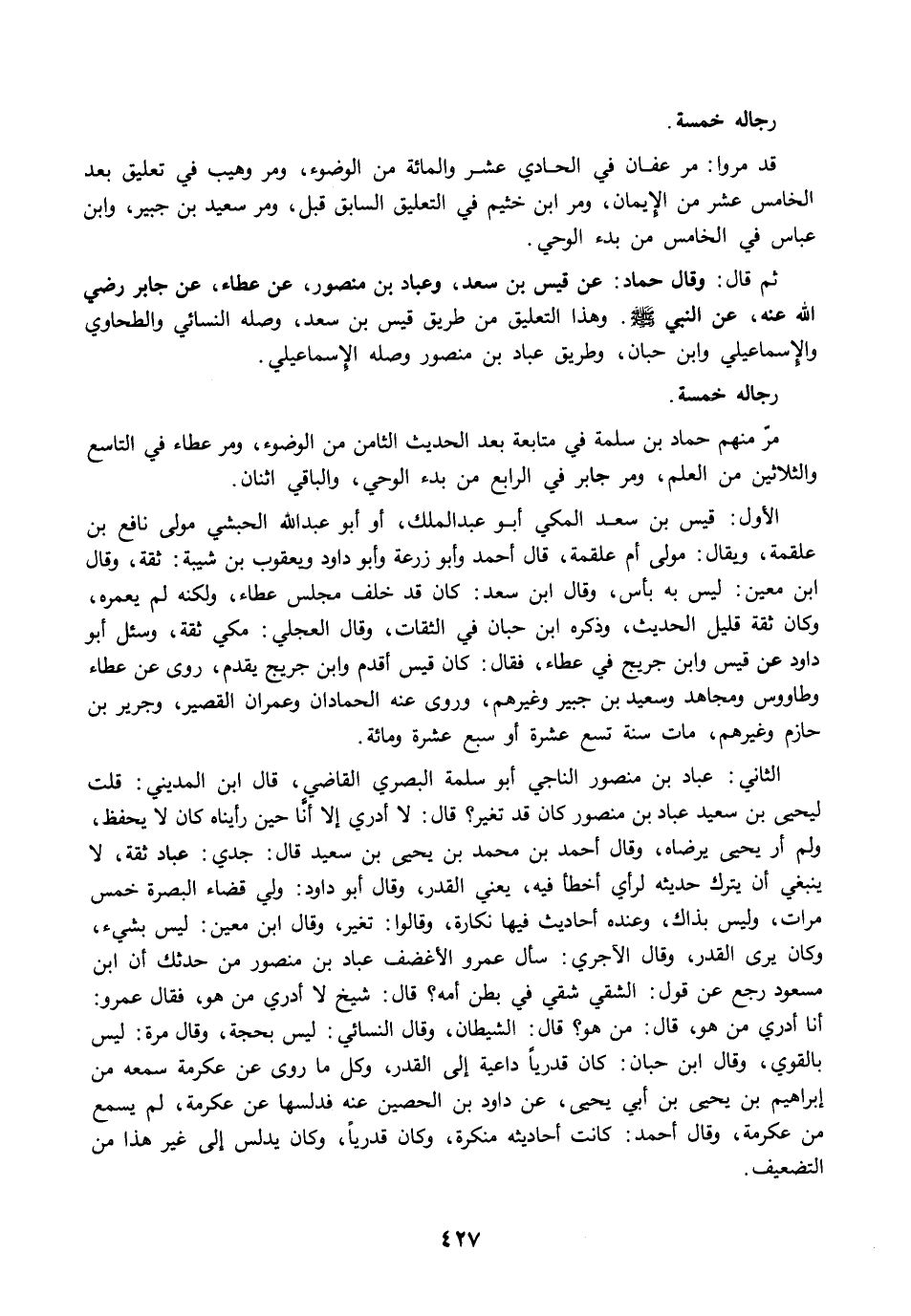 ثم قال: وقال حماد: عن قيس بن سعد، وعباد بن منصور، عن عطاء، عن جابر رضي الله عنه، عن النبي -صلى الله عليه وسلم-. وهذا التعليق من طريق قيس بن سعد، وصله النسائي والطحاوي والإسماعيلي وابن حبان، وطريق عباد بن منصور وصله الإسماعيلي.