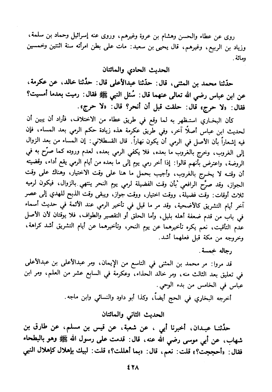 حَدَّثَنَا مُحَمَّدُ بْنُ الْمُثَنَّى، حَدَّثَنَا عَبْدُ الأَعْلَى قال: حَدَّثَنَا خَالِدٌ، عَنْ عِكْرِمَةَ، عَنِ ابْنِ عَبَّاسٍ رضي الله عنهما قَالَ: سُئِلَ النَّبِيُّ -صلى الله عليه وسلم- فَقَالَ: رَمَيْتُ بَعْدَمَا أَمْسَيْتُ؟ فَقَالَ: "لاَ حَرَجَ". قَالَ: حَلَقْتُ قَبْلَ أَنْ أَنْحَرَ؟ قَالَ: "لاَ حَرَجَ".