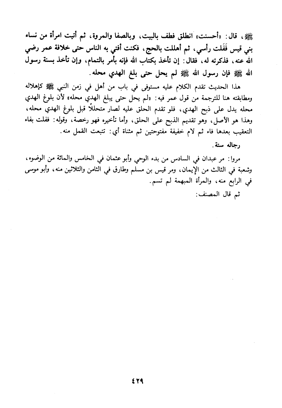 مرّوا: مرَّ عبدان في السادس من بدء الوحي وأبو عثمان في الخامس والمائة من الوضوء وشعبة في الثالث من الإيمان، ومرَّ قيس بن مسلم وطارق في الثامن والثلاثين منه، وأبو موسى في الرابع منه، والمرأة المبهمة لم تسم.