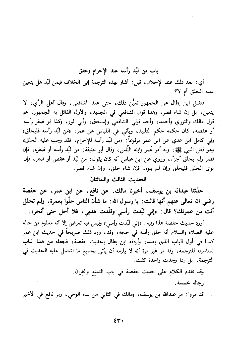 أورد حديث حفصة هذا وفيه: "إني لبّدت رأسي" وليس فيه تعرض إلا أنه معلوم من حاله عليه الصلاة والسلام أنه حلق رأسه في حجه، وقد ورد ذلك صريحًا في حديث ابن عمر كما في أول الباب الذي بعده، وأردفه ابن بطال بحديث حفصة، فجعله من هذا الباب لمناسبته للترجمة، وقد مرَّ غير مرة أنه لا يلزمه أن يأتي بجميع ما اشتمل عليه الحديث في الترجمة، بل إذا وجدت واحدة كفت.