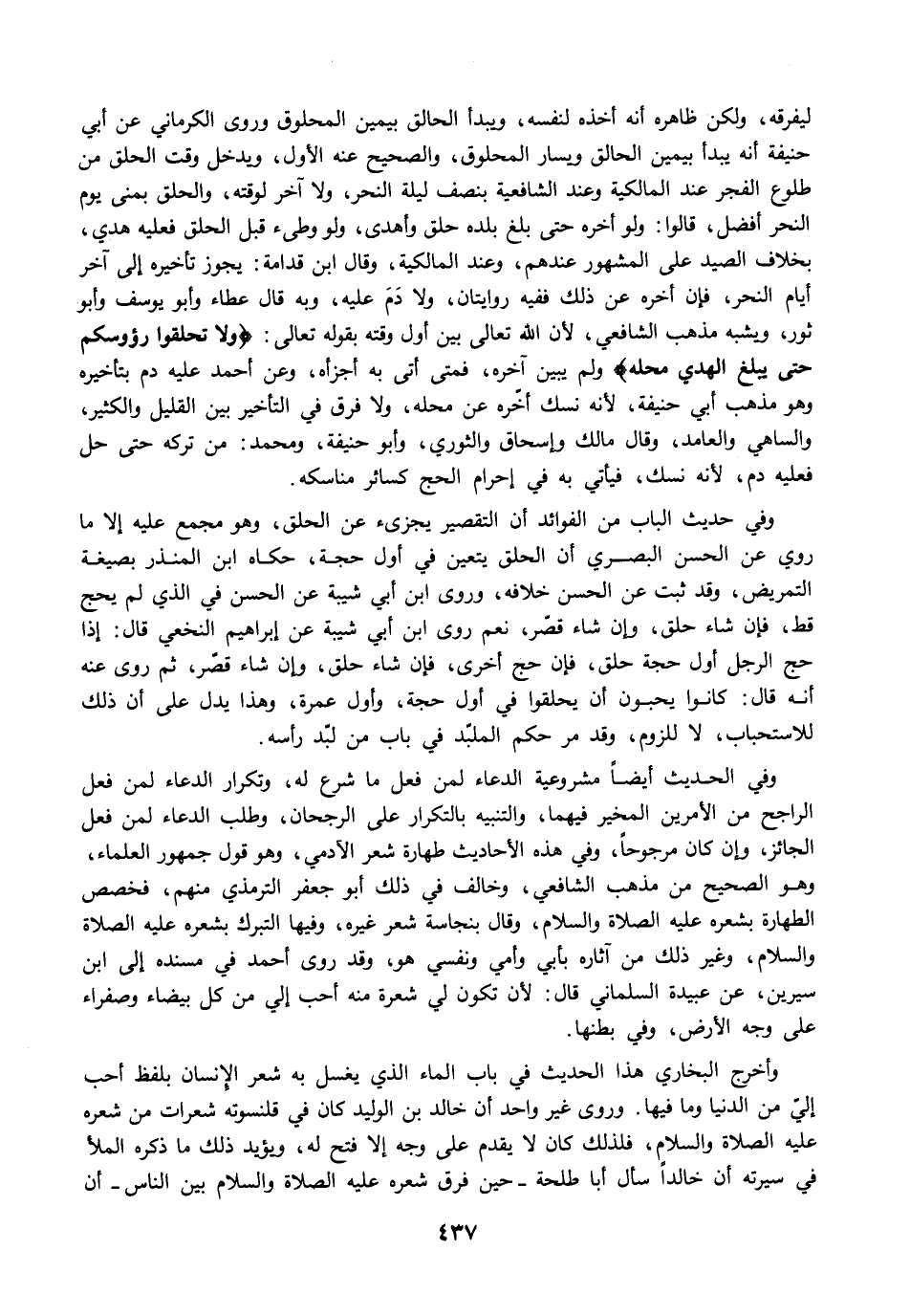 وفي الحديث أيضًا مشروعية الدعاء لمن فعل ما شرع له، وتكرار الدعاء لمن فعل الراجح من الأمرين المخير فيهما، والتنبيه بالتكرار على الرجحان، وطلب الدعاء لمن فعل الجائز، وإن كان مرجوحًا، وفي هذه الأحاديث طهارة شعر الآدمي، وهو قول جمهور العلماء، وهو الصحيح من مذهب الشافعي، وخالف في ذلك أبو جعفر الترمذي منهم، فخصص الطهارة بشعره عليه الصلاة والسلام، وقال بنجاسة شعر غيره، وفيها التبرك بشعره عليه الصلاة والسلام، وغير ذلك من آثاره بأبي وأمي ونفسي هو، وقد روى أحمد في مسنده إلى ابن سيرين، عن عبيدة السلماني قال: لأن تكون لي شعرة منه أحب إلى من كل بيضاء وصفراء على وجه الأرض، وفي بطنها.