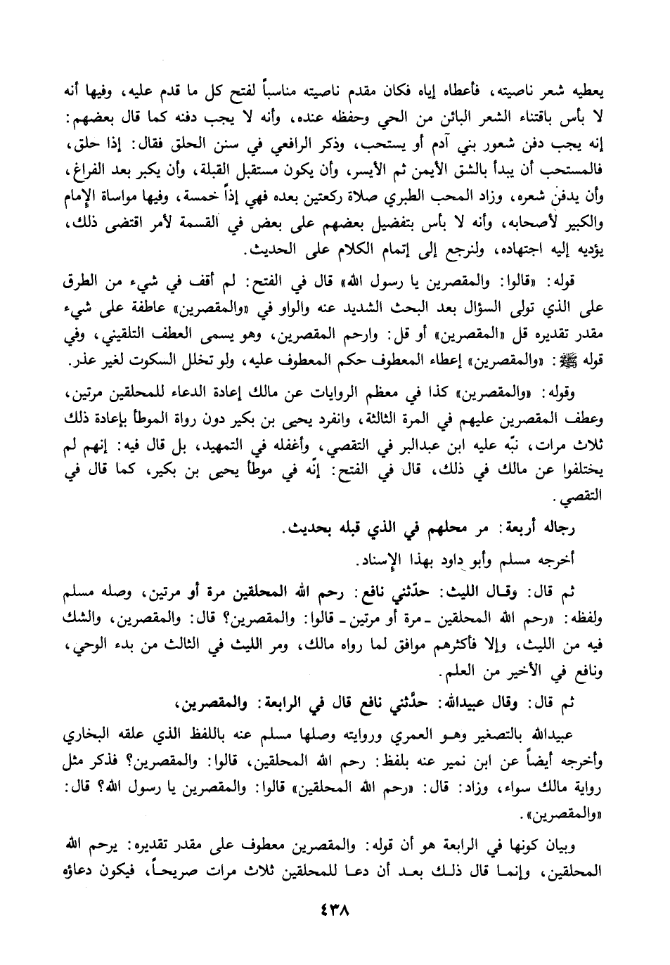 ثم قال: وقال الليث: حدَّثني نافع: رحم الله المحلقين مرة أو مرتين، وصله مسلم ولفظه: "رحم الله المحلقين -مرة أو مرتين- قالوا: والمقصرين؟ قال: والمقصرين، والشك فيه من الليث، وإلا فأكثرهم موافق لما رواه مالك، ومرَّ الليث في الثالث من بدء الوحي، ونافع في الأخير من العلم.