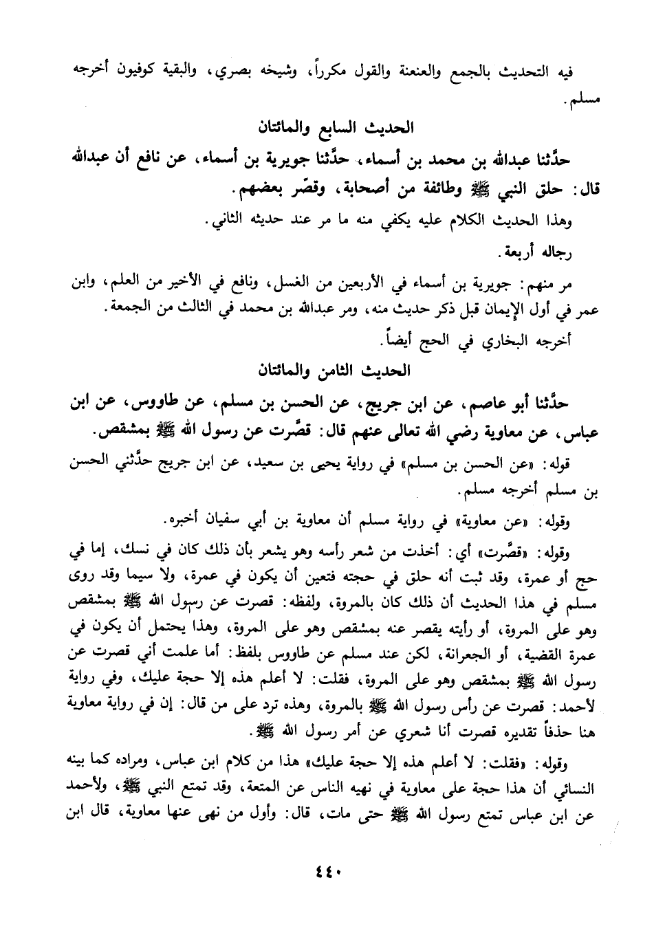 حَدَّثَنَا أَبُو عَاصِمٍ، عَنِ ابْنِ جُرَيْجٍ، عَنِ الْحَسَنِ بْنِ مُسْلِمٍ، عَنْ طَاوُسٍ، عَنِ ابْنِ عَبَّاسٍ، عَنْ مُعَاوِيَةَ رضي الله عنهم قَالَ: قَصَّرْتُ عَنْ رَسُولِ اللَّهِ -صلى الله عليه وسلم- بِمِشْقَصٍ.