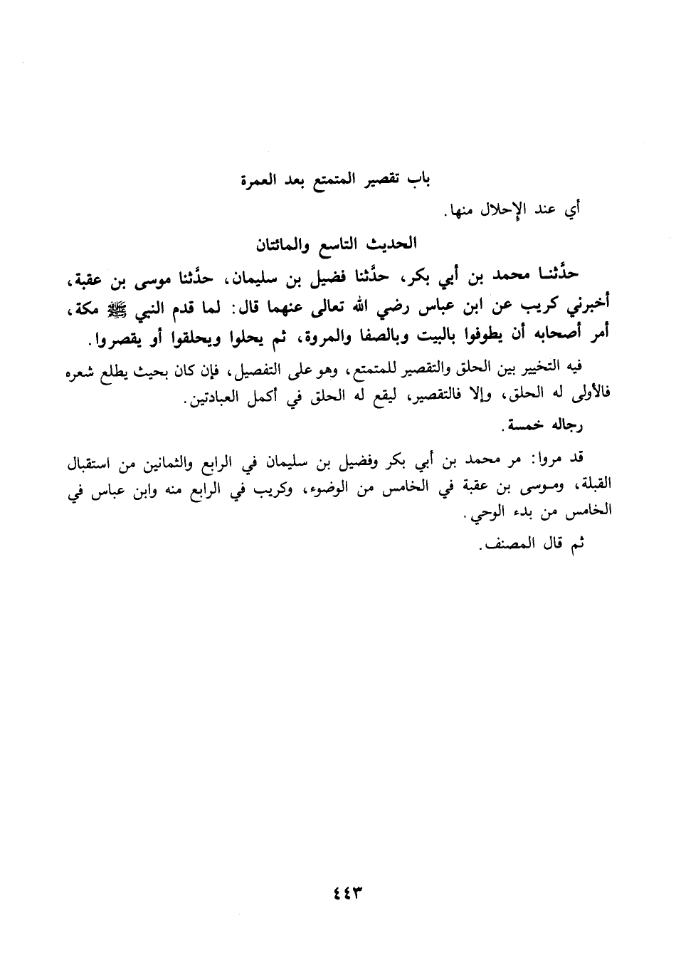 حَدَّثَنَا مُحَمَّدُ بْنُ أَبِي بَكْرٍ، حَدَّثَنَا فُضَيْلُ بْنُ سُلَيْمَانَ، حَدَّثَنَا مُوسَى بْنُ عُقْبَةَ، أَخْبَرَنِي كُرَيْبٌ عَنِ ابْنِ عَبَّاسٍ رضي الله عنهما قَالَ: لَمَّا قَدِمَ النَّبِيُّ -صلى الله عليه وسلم- مَكَّةَ، أَمَرَ أَصْحَابَهُ أَنْ يَطُوفُوا بِالْبَيْتِ، وَبِالصَّفَا وَالْمَرْوَةِ، ثُمَّ يَحِلُّوا، وَيَحْلِقُوا أَوْ يُقَصِّرُوا.