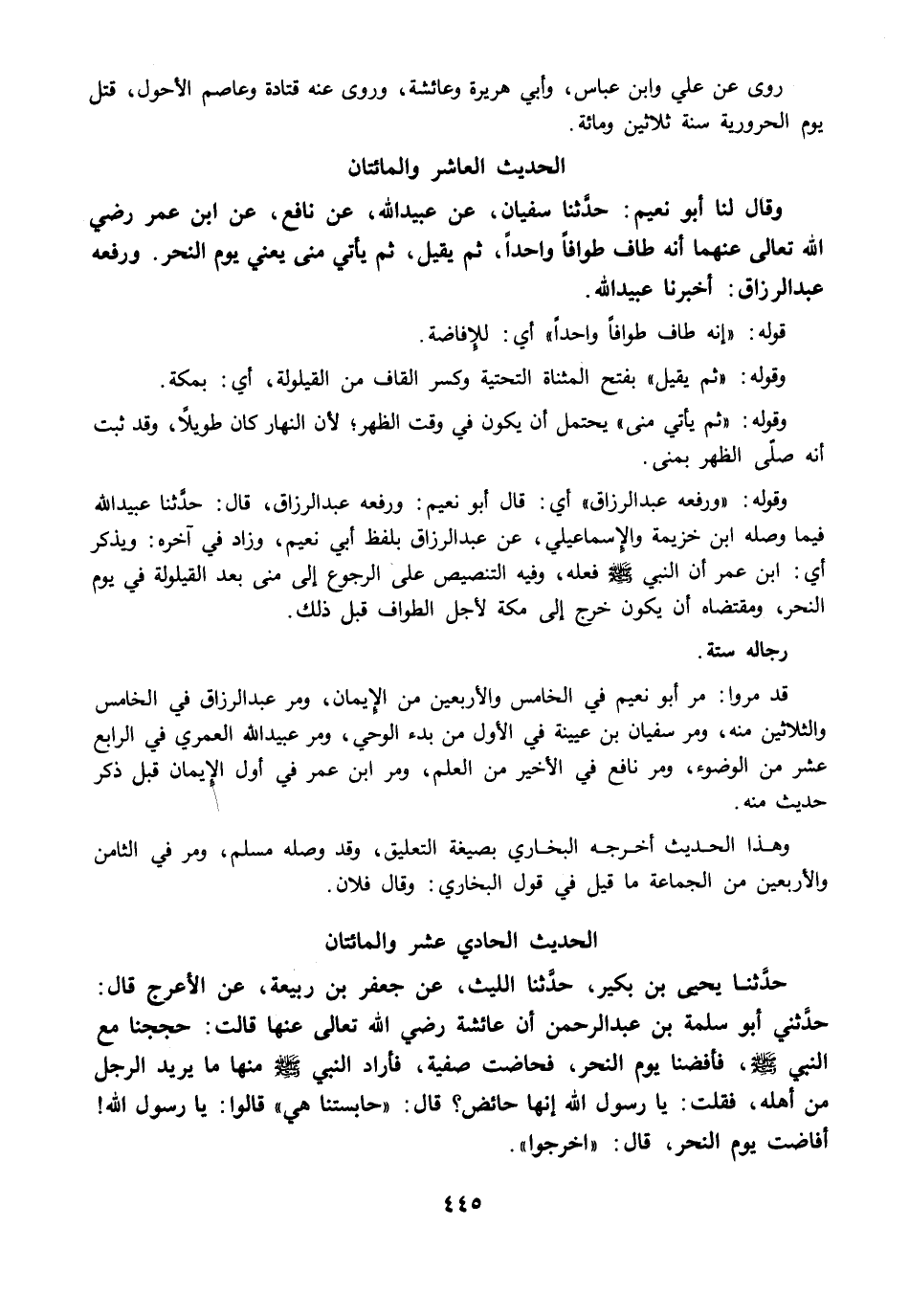 وَقَالَ لَنَا أَبُو نُعَيْمٍ: حَدَّثَنَا سُفْيَانُ، عَنْ عُبَيْدِ اللَّهِ، عَنْ نَافِعٍ، عَنِ ابْنِ عُمَرَ رضي الله عنهما أَنَّهُ طَافَ طَوَافًا وَاحِدًا، ثُمَّ يَقِيلُ، ثُمَّ يَأْتِي مِنًى - يَعْنِي يَوْمَ النَّحْرِ. وَرَفَعَهُ عَبْدُ الرَّزَّاقِ: أَخْبَرَنَا عُبَيْدُ اللَّهِ.