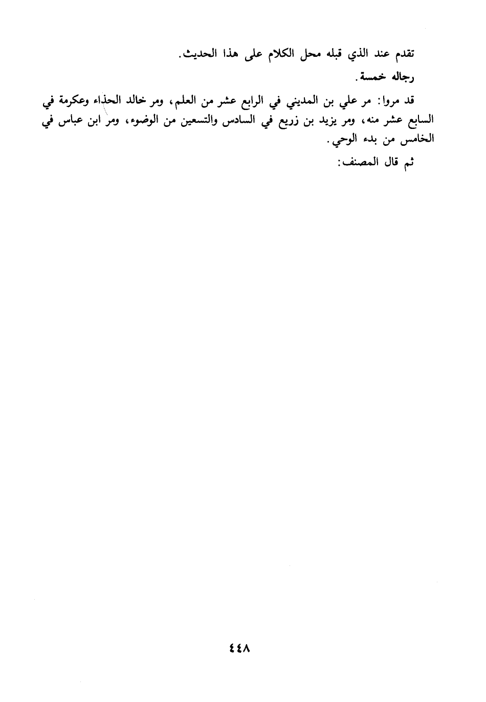 قد مرّوا: مرَّ علي بن المديني في الرابع عشر من العلم، ومرَّ خالد الحذاء وعكرمة في السابع عشر منه، ومرَّ يزيد بن زريع في السادس والتسعين من الوضوء ومرَّ ابن عباس في الخامس من بدء الوحي.