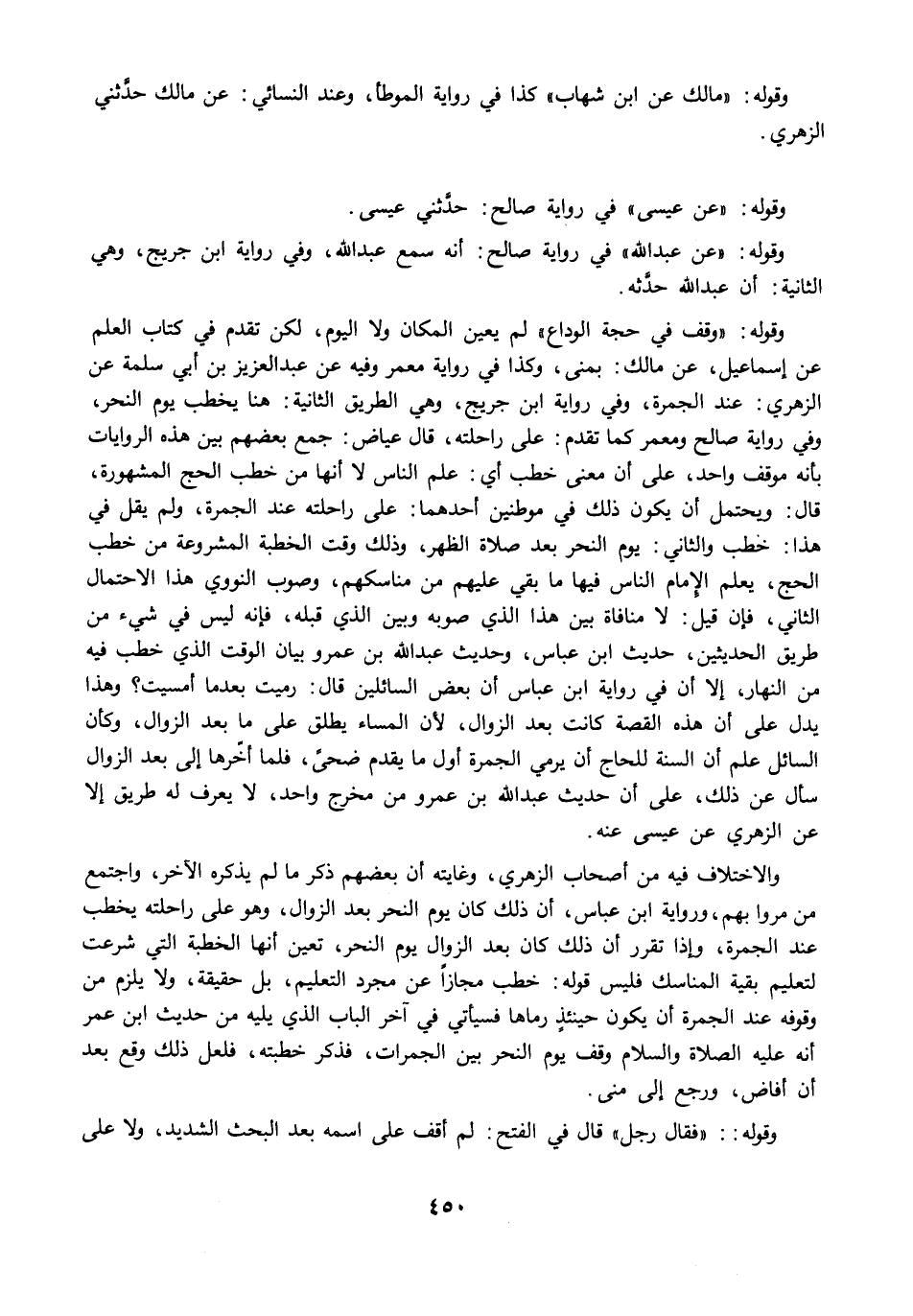 والاختلاف فيه من أصحاب الزهري، وغايته أن بعضهم ذكر ما لم يذكره الآخر، واجتمع من مرّوا بهم، ورواية ابن عباس، أن ذلك كان يوم النحر بعد الزوال، وهو على راحلته يخطب عند الجمرة، وإذا تقرر أن ذلك كان بعد الزوال يوم النحر، تعين أنها الخطبة التي شرعت لتعليم بقية المناسك فليس قوله: خطب مجازًا عن مجرد التعليم، بل حقيقة، ولا يلزم من وقوفه عند الجمرة أن يكون حينئذٍ رماها فسيأتي في آخر الباب الذي يليه من حديث ابن عمر أنه عليه الصلاة والسلام وقف يوم النحر بين الجمرات، فذكر خطبته، فلعل ذلك وقع بعد أن أفاض، ورجع إلى مني.