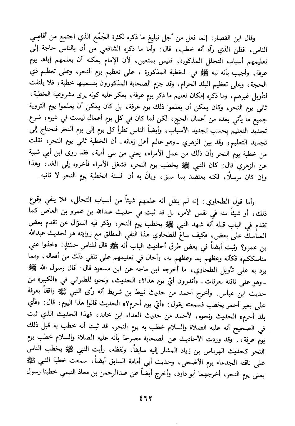 وأما قول الطحاوي: إنه لم ينقل أنه علمهم شيئًا من أسباب التحلل، فلا ينفي وقوع ذلك، أو شيئًا منه في نفس الأمر، بل قد ثبت في حديث عبد الله بن عمرو بن العاص كما تقدم في الباب قبله أنه شهد النبي -صلى الله عليه وسلم- يخطب يوم النحر، وذكر فيه السؤال عن تقدم بعض المناسك على بعض، فكيف ساغ للطحاوي هذا النفي المطلق مع روايته هو لحديث عبد الله بن عمرو؟ وثبت أيضًا في بعض طرق أحاديث الباب أنه -صلى الله عليه وسلم- قال للناس حينئذٍ: "خذوا عني مناسككم" فكأنه وعظهم بما وعظهم به، وأحال في تعليمهم على تلقي ذلك من أفعاله، ومما يرد به على تأويل الطحاوي، ما أخرجه ابن ماجه عن ابن مسعود قال: قال رسول الله -صلى الله عليه وسلم-وهو على ناقته بعرفات- "أتدرون أيّ يوم هذا؟ " الحديث، ونحوه للطبراني في "الكبير" من حديث ابن عباس. وأخرج أحمد من حديث نبيط بن شريط أنه رأى النبي -صلى الله عليه وسلم- واقفًا بعرفة على بعير أحمر يخطب فسمعته يقول: "أيّ يوم أحرم؟ " الحديث قالوا هذا اليوم، قال: "فأي بلد أحرم" الحديث ونحوه، لأحمد من حديث العداء ابن خالد، فهذا الحديث الذي ثبت في الصحيح أنه عليه الصلاة والسلام خطب به يوم النحر، قد ثبت أنه خطب به قبل ذلك يوم عرفة. وقد وردت الأحاديث عن الصحابة مصرحة بأنه عليه الصلاة والسلام خطب يوم النحر كحديث الهرماس بن زياد المشار إليه سابقًا، ولفظه، رأيت النبي -صلى الله عليه وسلم- يخطب الناس على ناقته الجدعاء يوم الأضحى، وحديث أبي أمامة السابق أيضًا، سمعت خطبة النبي -صلى الله عليه وسلم- بمنى يوم النحر، أخرجهما أبو داود، وأخرج أيضًا عن عبد الرحمن بن معاذ التيمي خطبنا رسول