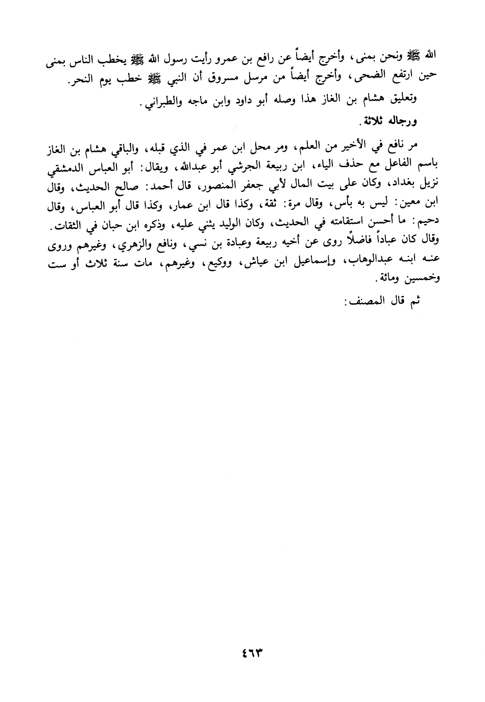 مرَّ نافع في الأخير من العلم، ومرَّ محل ابن عمر في الذي قبله، والباقي هشام بن الغاز باسم الفاعل مع حذف الياء، ابن ربيعة الجرشي أبو عبد الله، ويقال: أبو العباس الدمشقي نزيل بغداد، وكان على بيت المال لأبي جعفر المنصور، قال أحمد: صالح الحديث، وقال ابن معين: ليس به بأس، وقال مرة: ثقة، وكذا قال ابن عمار، وكذا قال أبو العباس، وقال دحيم: ما أحسن استقامته في الحديث، وكان الوليد يثني عليه، وذكره ابن حبان في الثقات. وقال كان عبادًا فاضلًا روى عن أخيه ربيعة وعبادة بن نسي، ونافع والزهري، وغيرهم وروى عنه ابنه عبد الوهاب، وإسماعيل ابن عياش، ووكيع، وغيرهم، مات سنة ثلاث أو ست وخمسين ومائة.