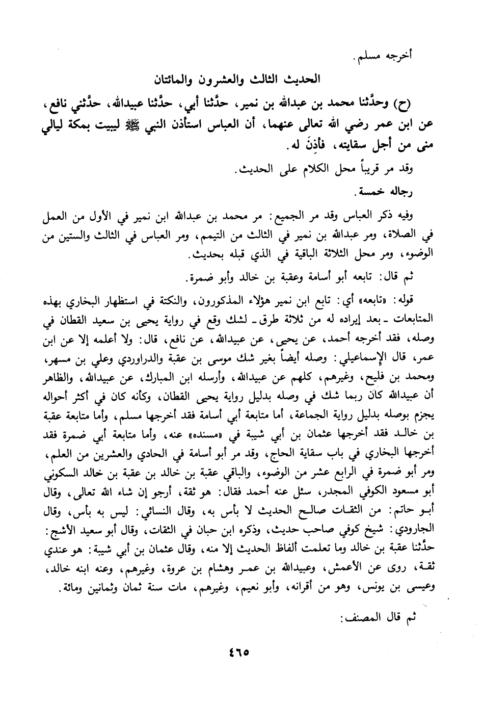 وفيه ذكر العباس وقد مرَّ الجميع: مرَّ محمد بن عبد الله ابن نمير في الأول من العمل في الصلاة، ومرَّ عبد الله بن نمير في الثالث من التيمم، ومرَّ العباس في الثالث والستين من الوضوء ومرَّ محل الثلاثة الباقية في الذي قبله بحديث.