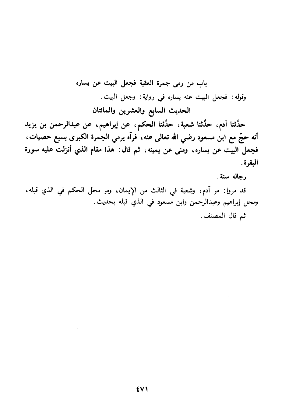 حَدَّثَنَا آدَمُ، حَدَّثَنَا شُعْبَةُ، حَدَّثَنَا الْحَكَمُ، عَنْ إِبْرَاهِيمَ، عَنْ عَبْدِ الرَّحْمَنِ بْنِ يَزِيدَ أَنَّهُ حَجَّ مَعَ ابْنِ مَسْعُودٍ رضي الله عنه، فَرَآهُ يَرْمِى الْجَمْرَةَ الْكُبْرَى بِسَبْعِ حَصَيَاتٍ، فَجَعَلَ الْبَيْتَ عَنْ يَسَارِهِ، وَمِنًى عَنْ يَمِينِهِ، ثُمَّ قَالَ هَذَا مَقَامُ الَّذِي أُنْزِلَتْ عَلَيْهِ سُورَةُ الْبَقَرَةِ.