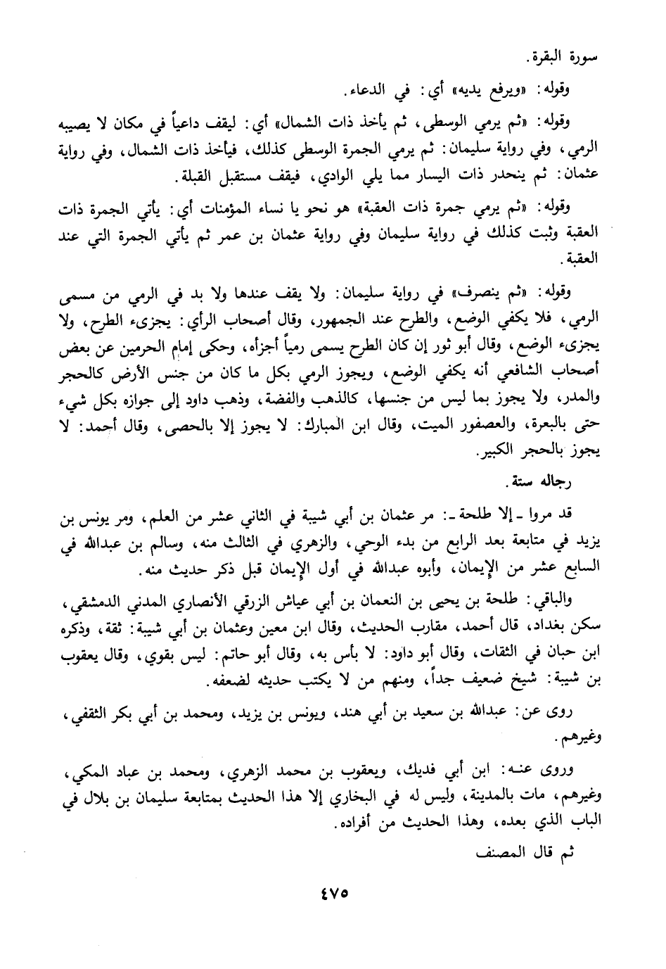 وقوله: "ثم يرمي جمرة ذات العقبة" هو نحو يا نساء المؤمنات أي: يأتي الجمرة ذات العقبة وثبت كذلك في رواية سليمان وفي رواية عثمان بن عمر ثم يأتي الجمرة التي عند العقبة.