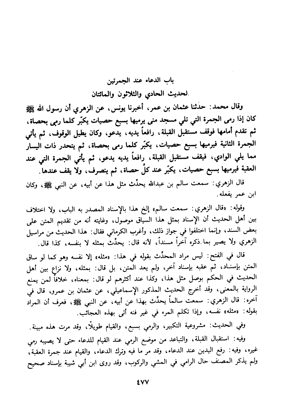 وَقَالَ مُحَمَّدٌ: حَدَّثَنَا عُثْمَانُ بْنُ عُمَرَ، أَخْبَرَنَا يُونُسُ، عَنِ الزُّهْرِيِّ أَنَّ رَسُولَ اللَّهِ -صلى الله عليه وسلم- كَانَ إِذَا رَمَى الْجَمْرَةَ الَّتِى تَلِي مَسْجِدَ مِنًى يَرْمِيهَا بِسَبْعِ حَصَيَاتٍ، يُكَبِّرُ كُلَّمَا رَمَى بِحَصَاةٍ، ثُمَّ تَقَدَّمَ أَمَامَهَا فَوَقَفَ مُسْتَقْبِلَ الْقِبْلَةِ رَافِعًا يَدَيْهِ يَدْعُو، وَكَانَ يُطِيلُ الْوُقُوفَ، ثُمَّ يَأْتِي الْجَمْرَةَ الثَّانِيَةَ، فَيَرْمِيهَا بِسَبْعِ حَصَيَاتٍ، يُكَبِّرُ كُلَّمَا رَمَى بِحَصَاةٍ، ثُمَّ يَنْحَدِرُ ذَاتَ الْيَسَارِ مِمَّا يَلِي الْوَادِي، فَيَقِفُ مُسْتَقْبِلَ الْقِبْلَةِ رَافِعًا يَدَيْهِ يَدْعُو، ثُمَّ يَأْتِي الْجَمْرَةَ الَّتِى عِنْدَ الْعَقَبَةِ فَيَرْمِيهَا بِسَبْعِ حَصَيَاتٍ، يُكَبِّرُ عِنْدَ كُلِّ حَصَاةٍ، ثُمَّ يَنْصَرِفُ وَلاَ يَقِفُ عِنْدَهَا.