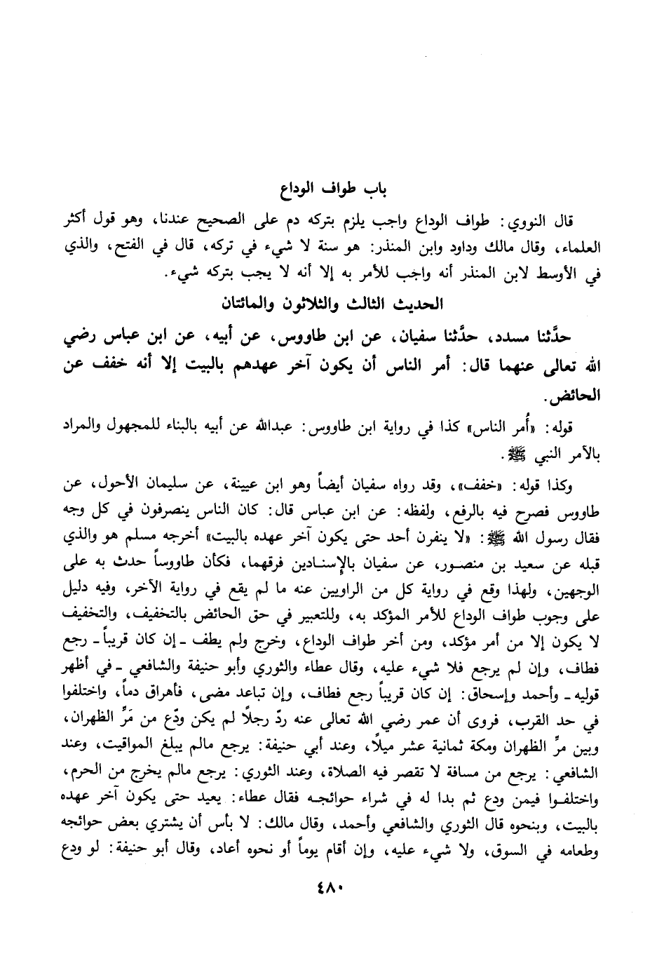 وكذا قوله: "خفف"، وقد رواه سفيان أيضًا وهو ابن عيينة، عن سليمان الأحول، عن طاووس فصرح فيه بالرفع، ولفظه: عن ابن عباس قال: كان الناس ينصرفون في كل وجه فقال رسول الله -صلى الله عليه وسلم-: "لا ينفرن أحد حتى يكون آخر عهده بالبيت" أخرجه مسلم هو والذي قبله عن سعيد بن منصور، عن سفيان بالإسنادين فرقهما، فكأن طاووسًا حدث به على الوجهين، ولهذا وقع في رواية كل من الراويين عنه ما لم يقع في رواية الآخر، وفيه دليل على وجوب طواف الوداع للأمر المؤكد به، وللتعبير في حق الحائض بالتخفيف، والتخفيف لا يكون إلا من أمر مؤكد، ومن أخر طواف الوداع، وخرج ولم يطف -إن كان قريبًا- رجع فطاف، وإن لم يرجع فلا شيء عليه، وقال عطاء والثوري وأبو حنيفة والشافعي -في أظهر قوليه- وأحمد وإسحاق: إن كان قريبًا رجع فطاف، وإن تباعد مضى، فأهراق دمًا، واختلفوا في حد القرب، فروى أن عمر رضي الله تعالى عنه ردّ رجلًا لم يكن ودّع من مَرِّ الظهران، وبين مرِّ الظهران ومكة ثمانية عشر ميلًا، وعند أبي حنيفة: يرجع ما لم يبلغ المواقيت، وعند الشافعي: يرجع من مسافة لا تقصر فيه الصلاة، وعند الثوري: يرجع ما لم يخرج من الحرم، واختلفوا فيمن ودع ثم بدا له في شراء حوائجه فقال عطاء: يعيد حتى يكون آخر عهده بالبيت، وبنحوه قال الثوري والشافعي وأحمد، وقال مالك: لا بأس أن يشتري بعض حوائجه وطعامه في السوق، ولا شيء عليه، وإن أقام يومًا أو نحوه أعاد، وقال أبو حنيفة: لو ودع