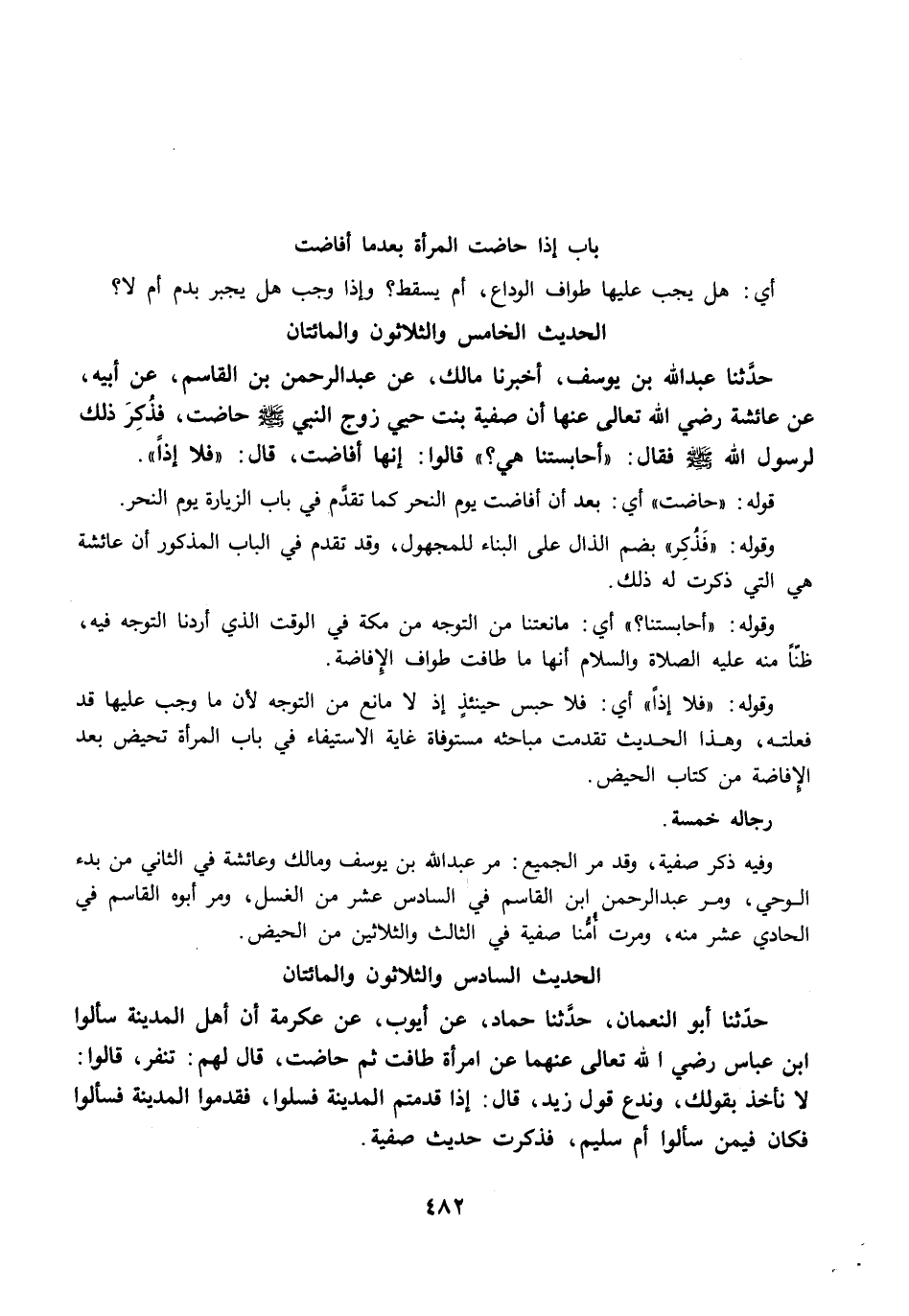 حَدَّثَنَا عَبْدُ اللَّهِ بْنُ يُوسُفَ، أَخْبَرَنَا مَالِكٌ، عَنْ عَبْدِ الرَّحْمَنِ بْنِ الْقَاسِمِ، عَنْ أَبِيهِ، عَنْ عَائِشَةَ رضي الله عنها أَنَّ صَفِيَّةَ بِنْتَ حُيَيٍّ زَوْجَ النَّبِيِّ -صلى الله عليه وسلم- حَاضَتْ، فَذَكَرْتُ ذَلِكَ لِرَسُولِ اللَّهِ -صلى الله عليه وسلم- فَقَالَ: "أَحَابِسَتُنَا هِيَ؟ " قَالُوا: إِنَّهَا قَدْ أَفَاضَتْ. قَالَ: "فَلاَ إِذًا".