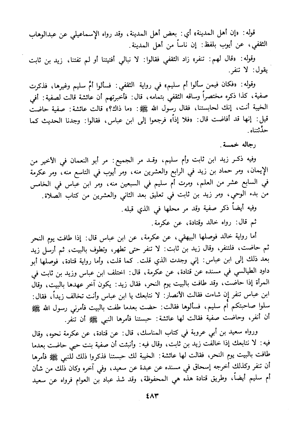 ورواه سعيد بن أبي عروبة في كتاب المناسك، قال: عن قتادة، عن عكرمة نحوه، وقال فيه: لا نتابعك إذا خالفت زيد بن ثابت، وقال فيه: وأنبئت أن صفية بنت حيي حاضت بعدما طافت بالبيت يوم النحر، فقالت لها عائشة: الخيبة لك حبستنا فذكروا ذلك للنبي -صلى الله عليه وسلم- فأمرها أن تنفر وكذلك أخرجه إسحاق في مسنده عن عبدة عن سعيد، وفي آخره وكان ذلك من شأن أم سليم أيضًا، وطريق قتادة هذه هي المحفوظة، وقد شذ عباد بن العوام فرواه عن سعيد