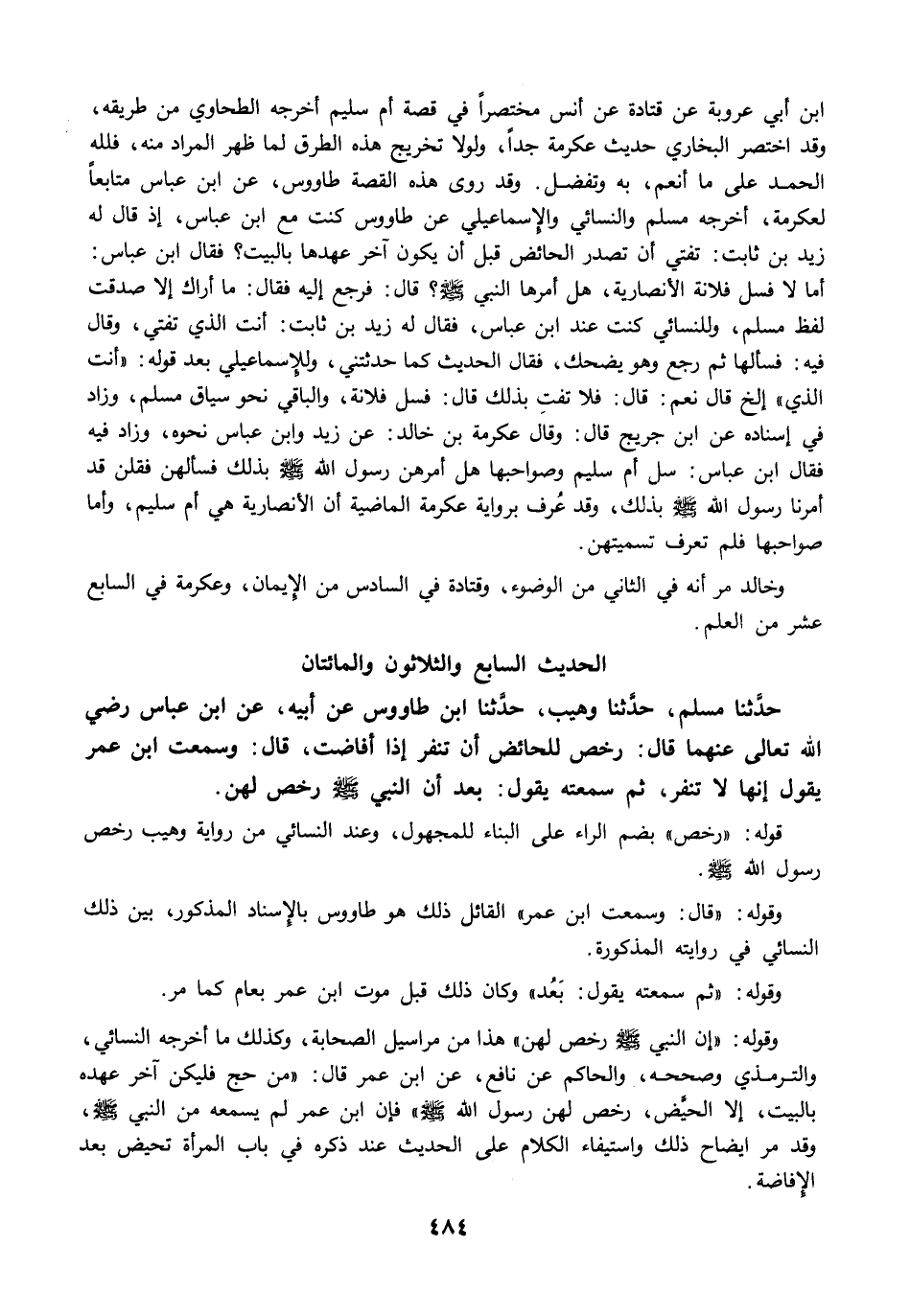 ابن أبي عروبة عن قتادة عن أنس مختصرًا في قصة أم سليم أخرجه الطحاوي من طريقه، وقد اختصر البخاري حديث عكرمة جدًا، ولولا تخريج هذه الطرق لما ظهر المراد منه، فلله الحمد على ما أنعم به وتفضل. وقد روى هذه القصة طاووس، عن ابن عباس متابعًا لعكرمة، أخرجه مسلم والنسائي والإسماعيلي عن طاووس كنت مع ابن عباس، إذ قال له زيد بن ثابت: تفتي أن تصدر الحائض قبل أن يكون آخر عهدها بالبيت؟ فقال ابن عباس: أما لا فسل فلانة الأنصارية، هل أمرها النبي -صلى الله عليه وسلم-؟ قال: فرجع إليه فقال: ما أراك إلا صدقت لفظ مسلم، وللنسائي كنت عند ابن عباس، فقال له زيد بن ثابت: أنت الذي تفتي، وقال فيه: فسألها ثم رجع وهو يضحك، فقال الحديث كما حدثتني، وللإسماعيلي بعد قوله: "أنت الذي" إلخ قال نعم: قال: فلا تفتِ بذلك قال: غسل فلانة، والباقي نحو سياق مسلم، وزاد في إسناده عن ابن جريج قال: وقال عكرمة بن خالد: عن زيد وابن عباس نحوه، وزاد فيه فقال ابن عباس: سل أم سليم وصواحبها هل أمرهن رسول الله -صلى الله عليه وسلم- بذلك فسألهن فقلن قد أمرنا رسول الله -صلى الله عليه وسلم- بذلك، وقد عُرف برواية عكرمة الماضية أن الأنصارية هي أم سليم، وأما صواحبها فلم تعرف تسميتهن.