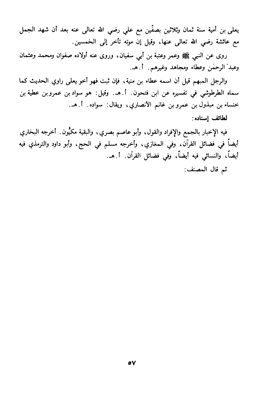 روى عن النبي -صلى الله عليه وسلم- وعمر وعتبة بن أبي سفيان، وروى عنه أولاده صفوان ومحمد وعثمان وعبد الرحمن وعطاء ومجاهد وغيرهم. أ. هـ.