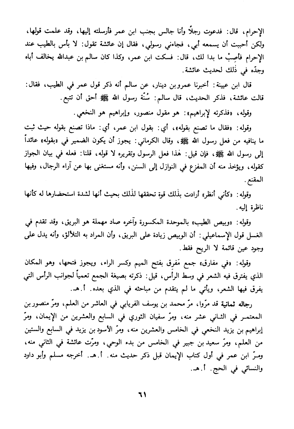 رجاله ثمانية قد مرّوا، مرّ محمد بن يوسف الفريابي في العاشر من العلم، ومرّ منصور بن المعتمر في الثاني عشر منه، ومرّ سفيان الثوري في السابع والعشرين من الإِيمان، ومرّ إبراهيم بن يزيد النخعي في الخامس والعشرين منه، ومرّ الأسود بن يزيد في السابع والستين من العلم، ومرّ سعيد بن جبير في الخامس من بدء الوحي، ومرّت عائشة في الثاني منه، ومرّ ابن عمر في أول كتاب الإِيمان قبل ذكر حديث منه. أ. هـ. أخرجه مسلم وأبو داود والنسائي في الحج. أ. هـ.