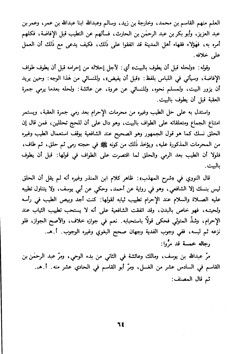 العلم منهم القاسم بن محمد، وخارجة بن زيد، وسالم وعبد الله ابنا عبد الله بن عمر، وعمر بن عبد العزيز، وأبو بكر بن عبد الرحمن بن الحارث، فسألهم عن التطيب قبل الإِفاضة، فكلهم أمره به، فهؤلاء فقهاء أهل المدينة قد اتفقوا على ذلك، فكيف يدعى مع ذلك أن العمل على خلافه.