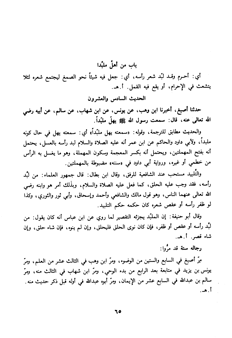 حَدَّثَنَا أَصْبَغُ، أَخْبَرَنَا ابْنُ وَهْبٍ، عَنْ يُونُسَ، عَنِ ابْنِ شِهَابٍ، عَنْ سَالِمٍ، عَنْ أَبِيهِ رضي الله عنه، قَالَ: سَمِعْتُ رَسُولَ اللَّهِ -صلى الله عليه وسلم- يُهِلُّ مُلَبِّدًا.