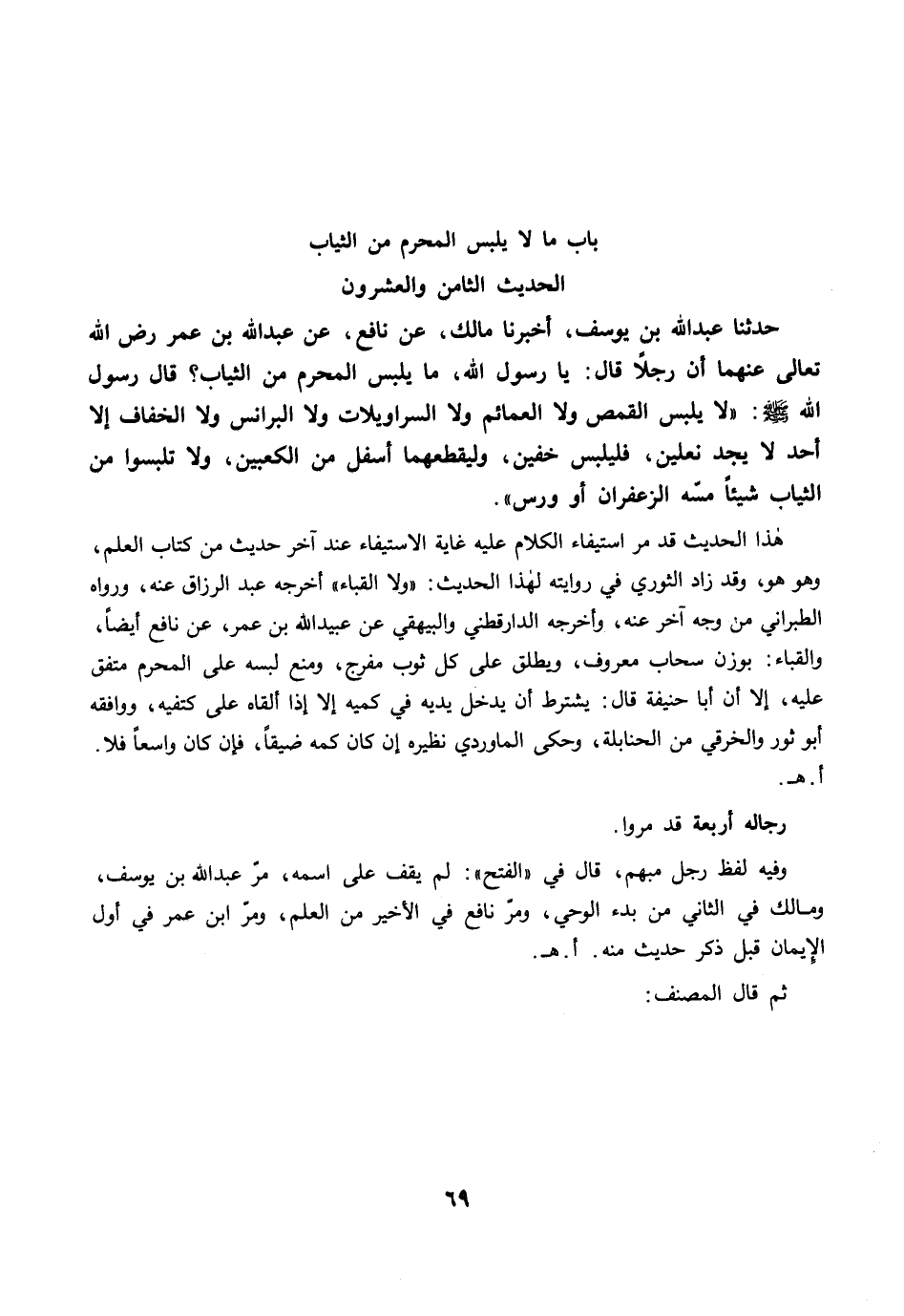 هذا الحديث قد مرَّ استيفاء الكلام عليه غاية الاستيفاء عند آخر حديث من كتاب العلم، وهو هو، وقد زاد الثوري في روايته لهذا الحديث: "ولا القباء" أخرجه عبد الرزاق عنه، ورواه الطبراني من وجه آخر عنه، وأخرجه الدارقطني والبيهقي عن عبيد الله بن عمر، عن نافع أيضًا، والقباء: بوزن سحاب معروف، ويطلق على كل ثوب مفرج، ومنع لبسه على المحرم متفق عليه، إلا أن أبا حنيفة قال: يشترط أن يدخل يديه في كميه إلا إذا ألقاه على كتفيه، ووافقه أبو ثور والخرقي من الحنابلة، وحكى الماوردي نظيره إن كان كمه ضيقًا، فإن كان واسعًا فلا. أ. هـ.